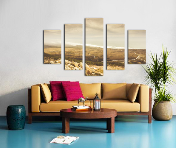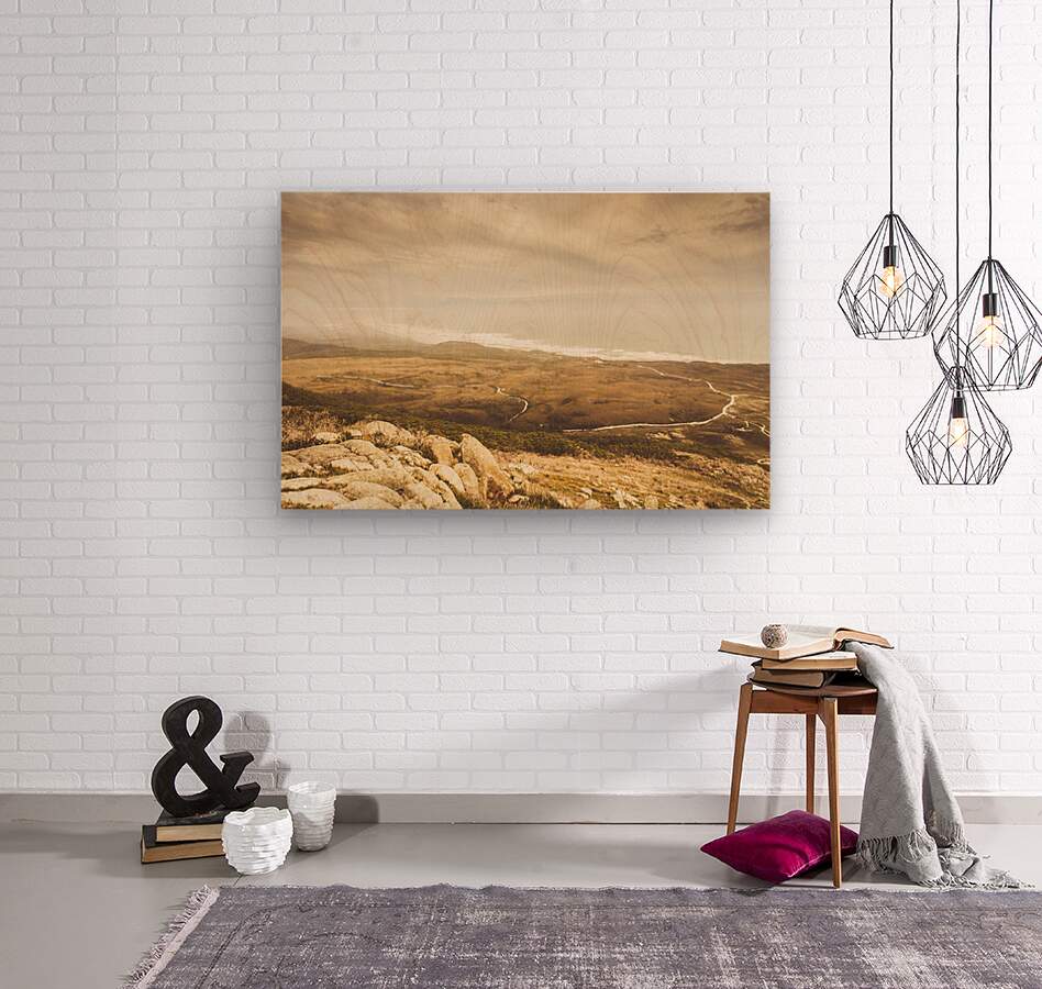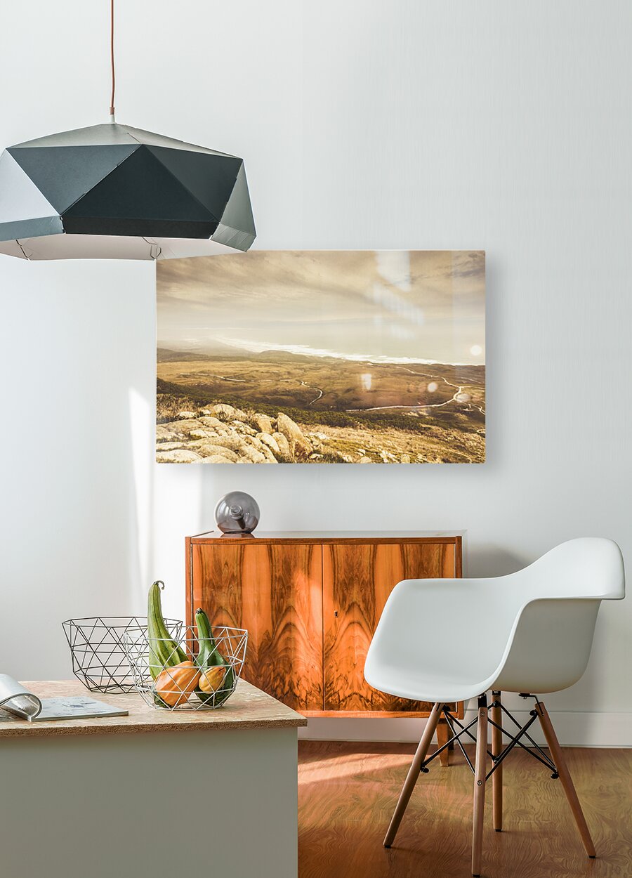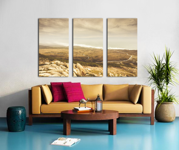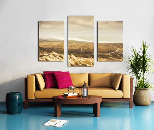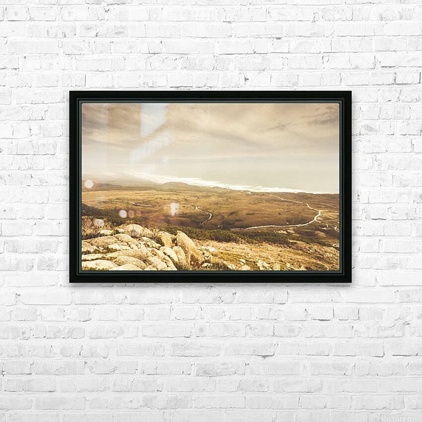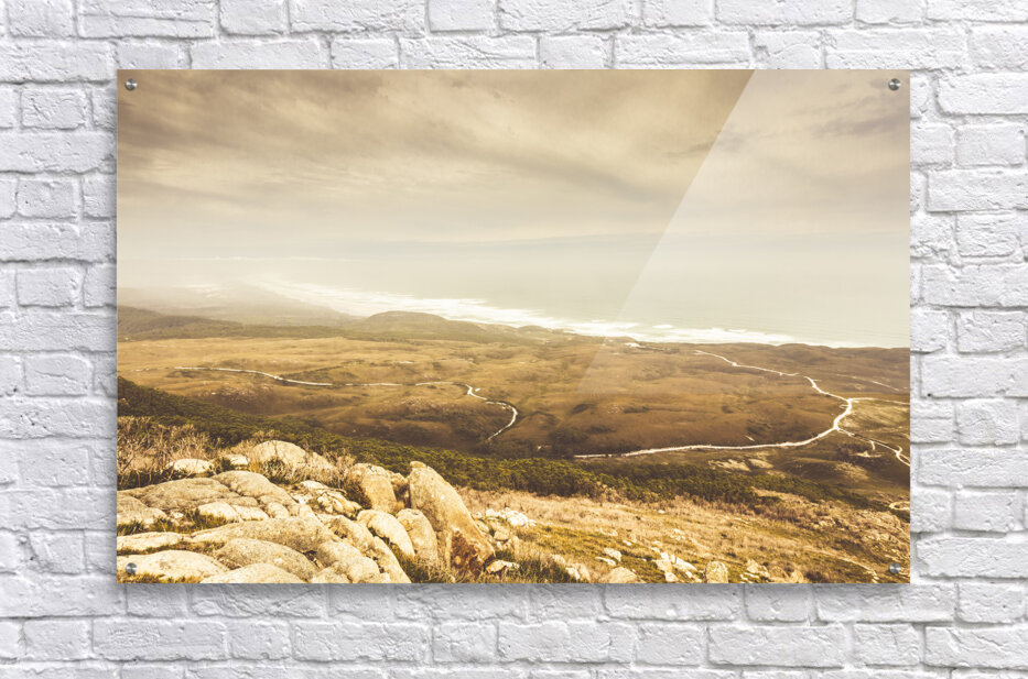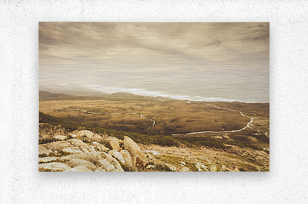 Vintage fine art landscape on a mountain outlook of remote roads and foggy coastlines. Trial Harbour Regional Reserve to Ocean Beach Western Tasmania Australia