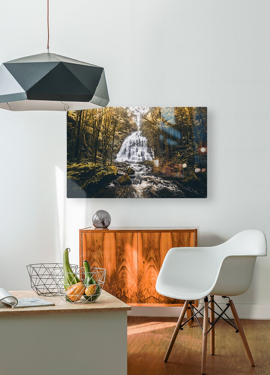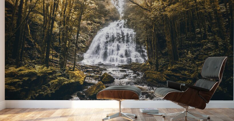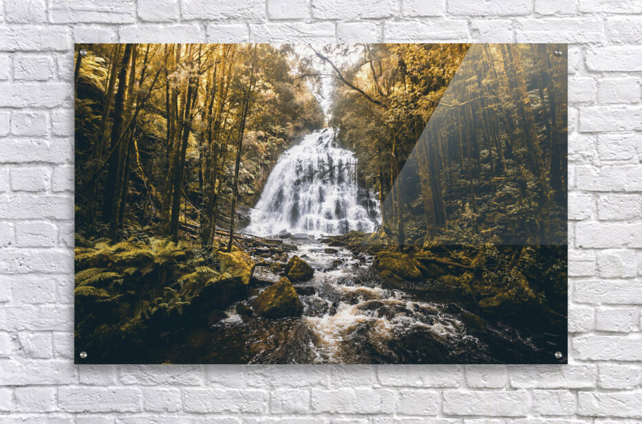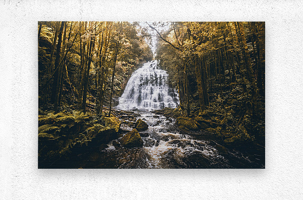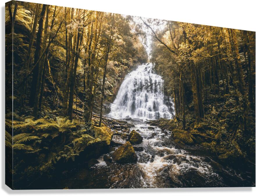 Autumnal colored landscape art on a gorgeous nature still of flowing waters from dreamy jungles. Nelson Falls Franklin-Gordon Wild Rivers National Par...[+]
