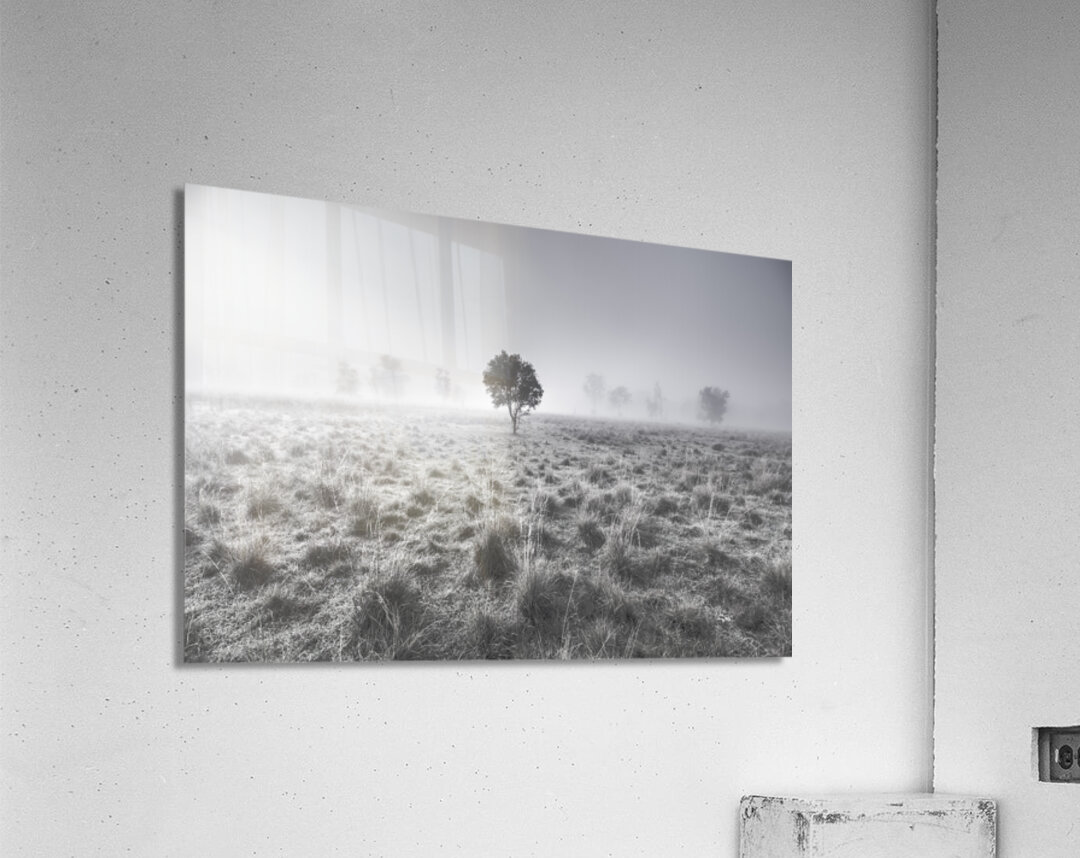 Amazing country field landscape with trees hazed in shades of violet fog. Wondrous misty background taken Alleena NSW Australia