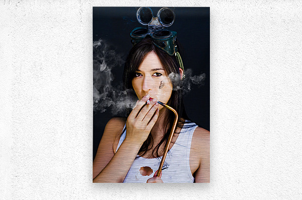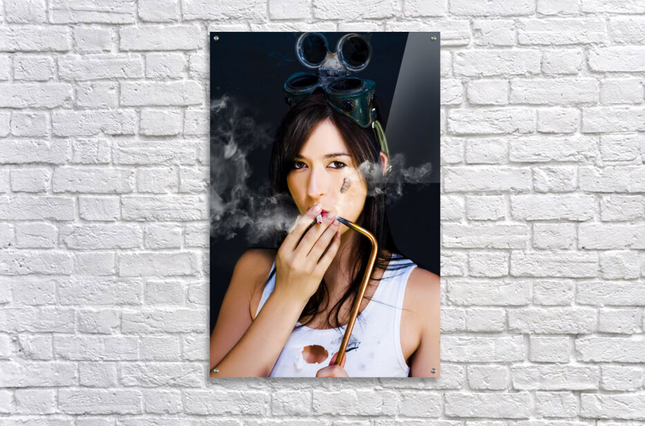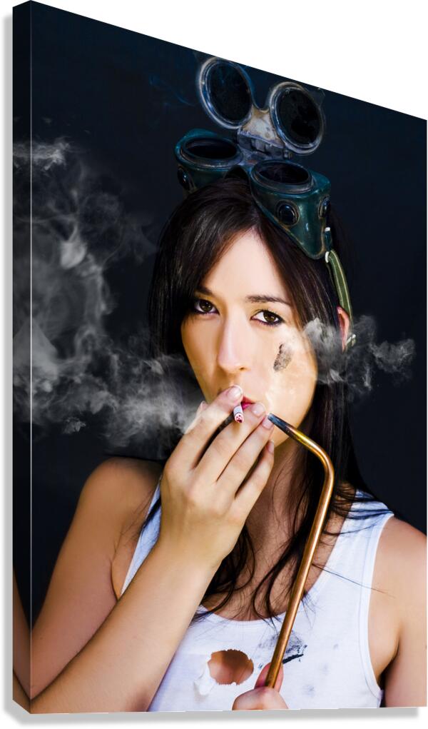 Attractive woman with welding goggles smoking a cigarette off the flame of a welding torch in a industrial fumes conceptual