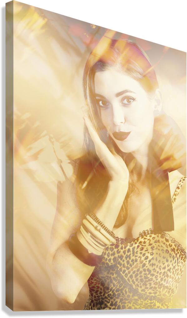 Unique fashion portrait of a pretty young pin-up woman in a reflection of orange hues and leafy highlights. Fashion abstraction