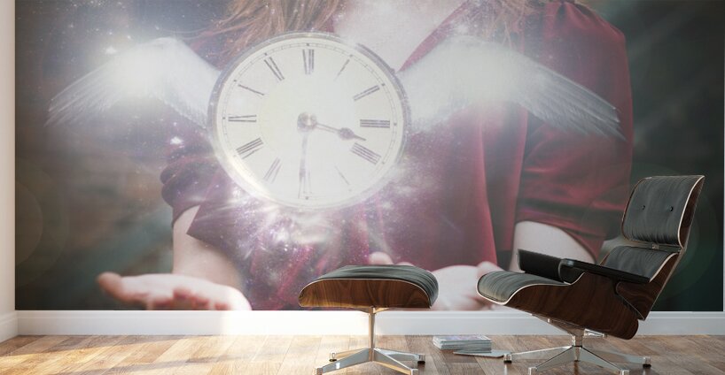 A flight in time feathers and minutes twinkle of an eye too late to revise lost to forever wings to a motion a movement in space a clock against a rac...[+]