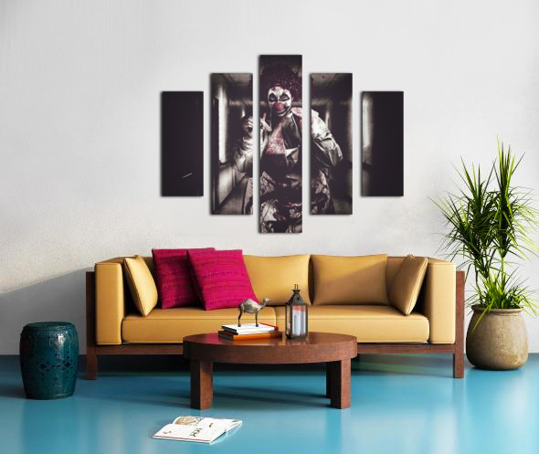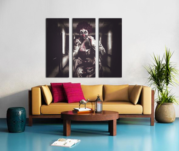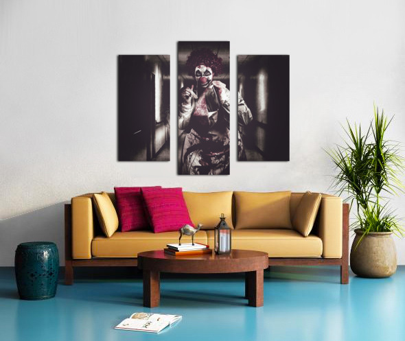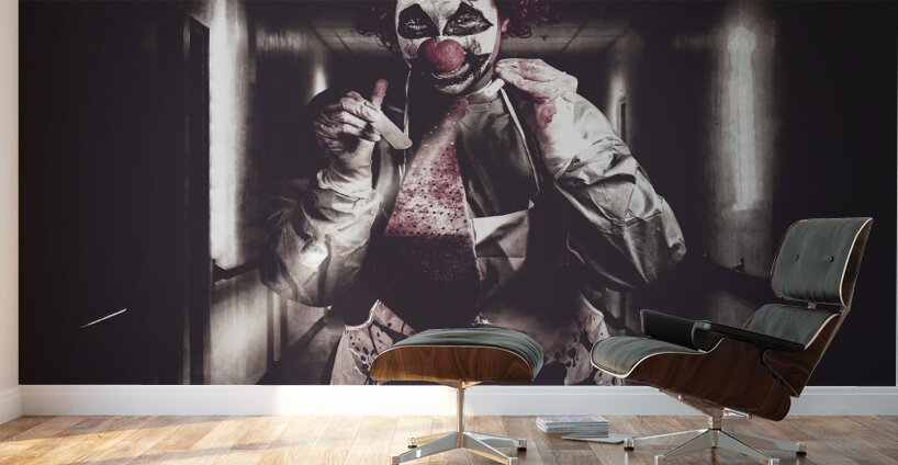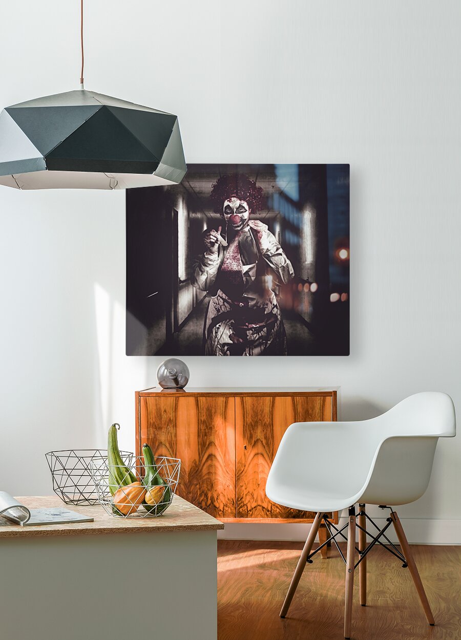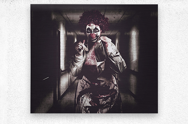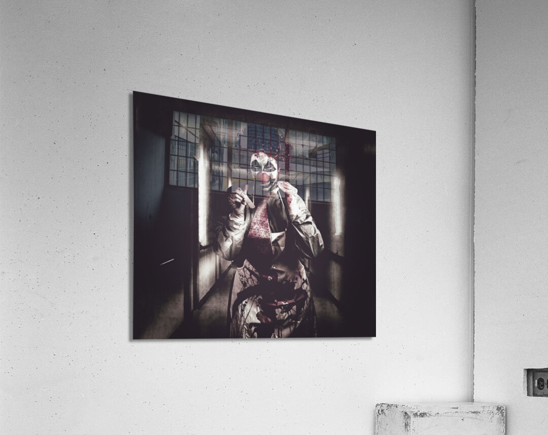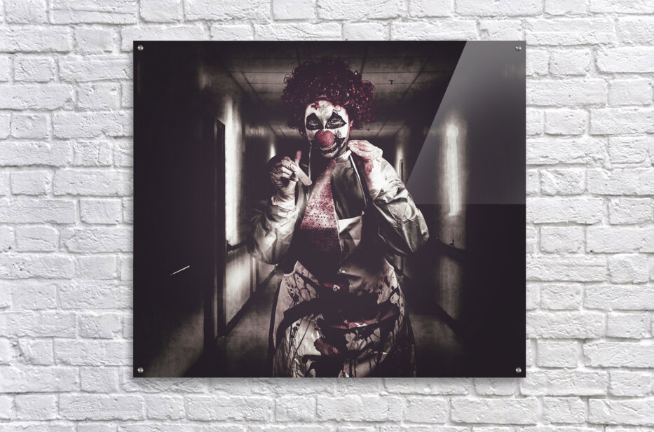 Get this artwork "Creepy medical clown in grunge hospital hallway" in a framed print.