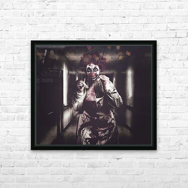Creepy medical clown in grunge hospital hallway Picture Frame Printing