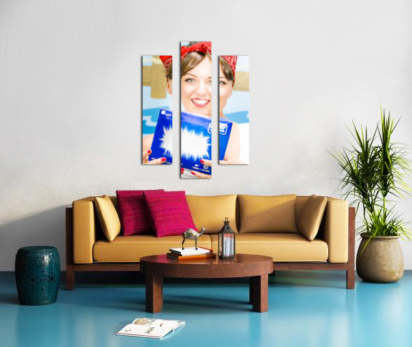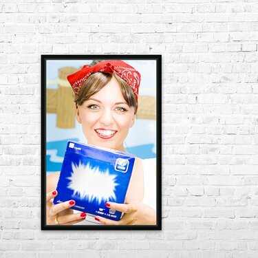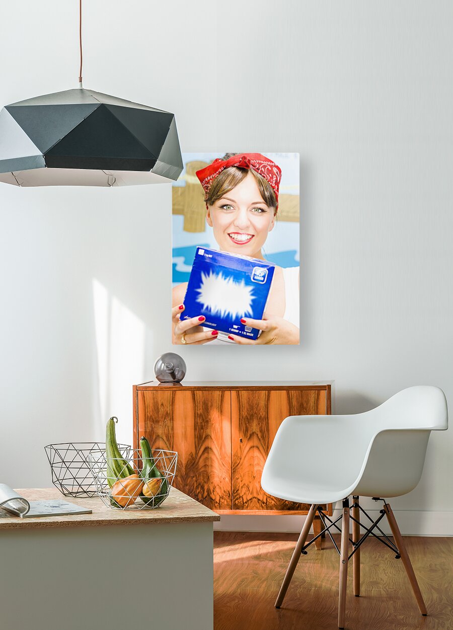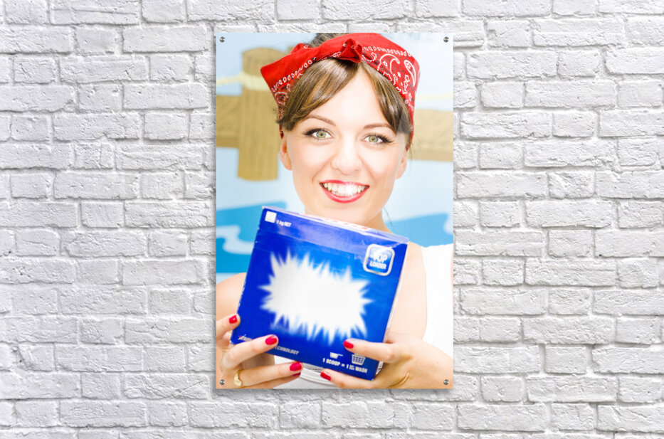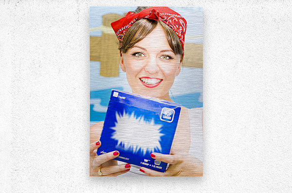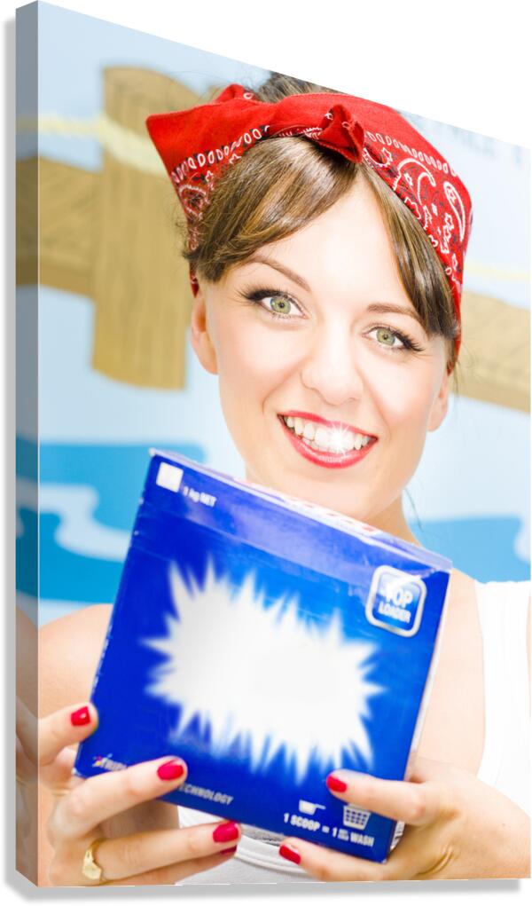 A Sparkle Is In The Smile Of A Woman Holding Up A Box Of Laundry Detergent Washing Powder In The Process Of House Work In A 1970 Stylised Lifestyle Im...[+]
