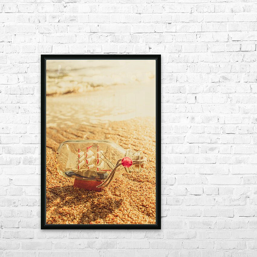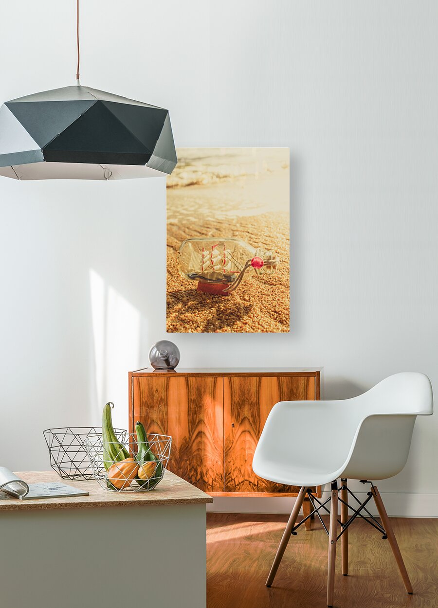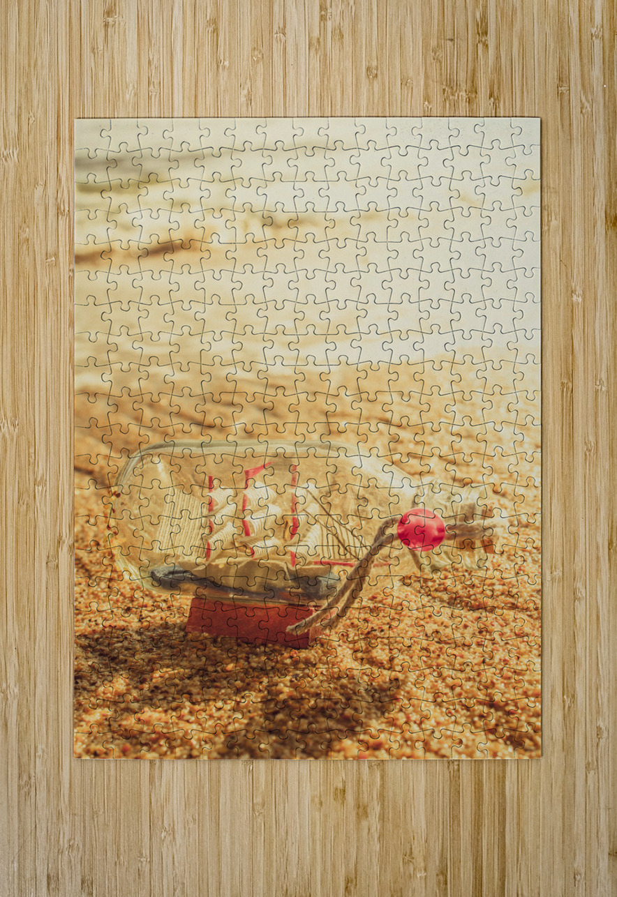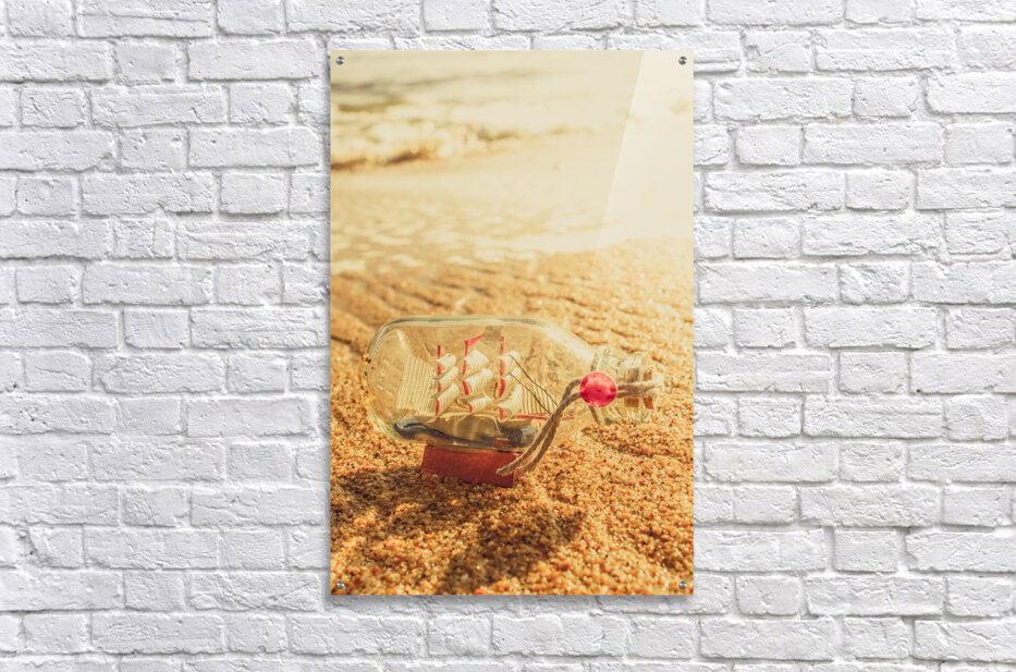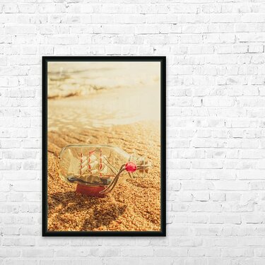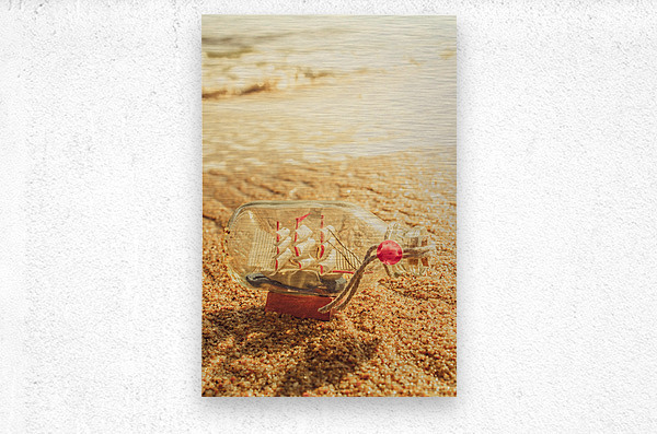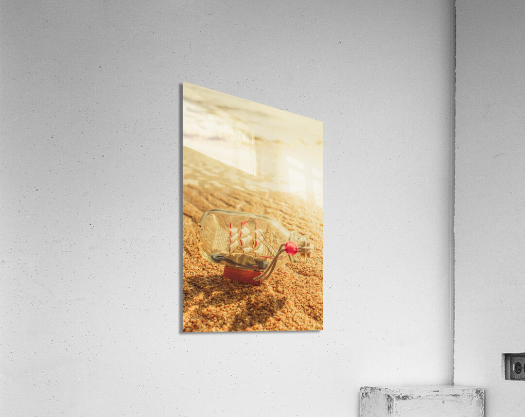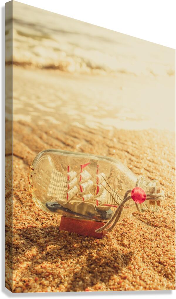 Maritime conceptual artwork of a nautical glass bottle boat by the sea. Still-life journey