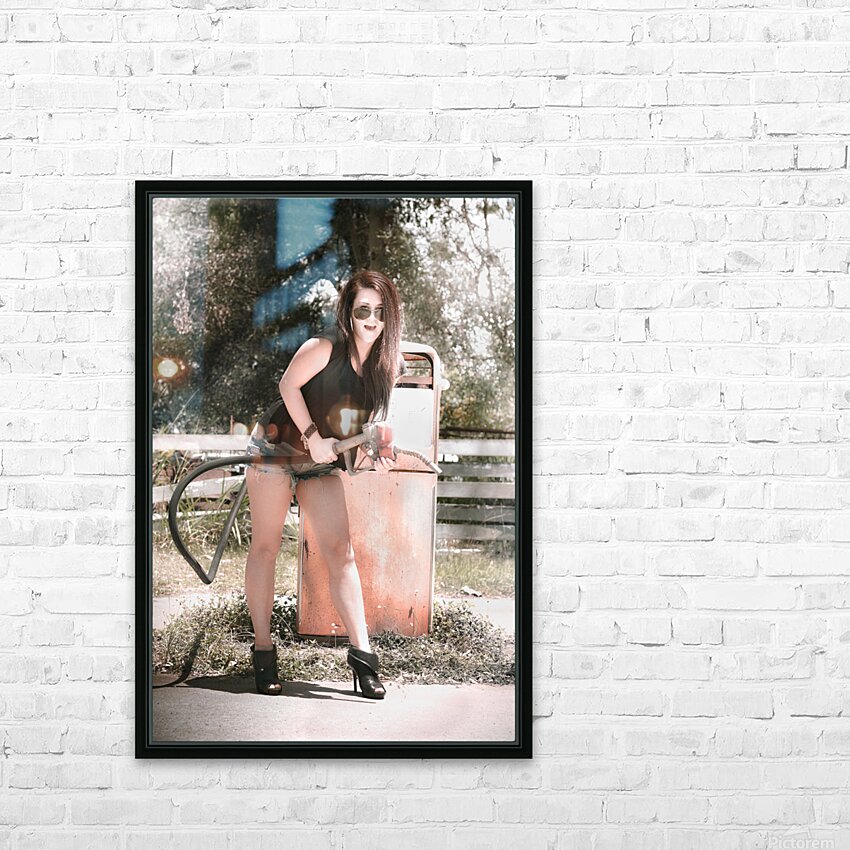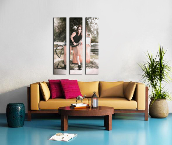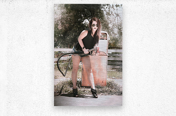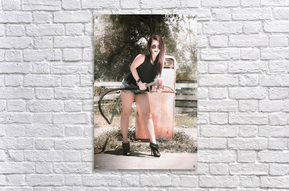 Retro Americana woman riding high on gasoline fumes does the petrol shop rock with a vintage gas pump bowser in a classic service garage ad