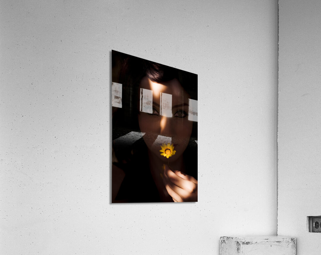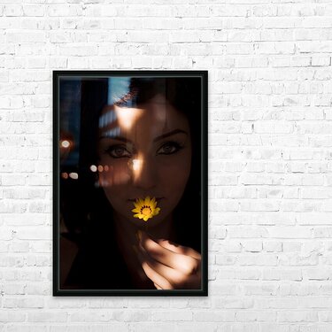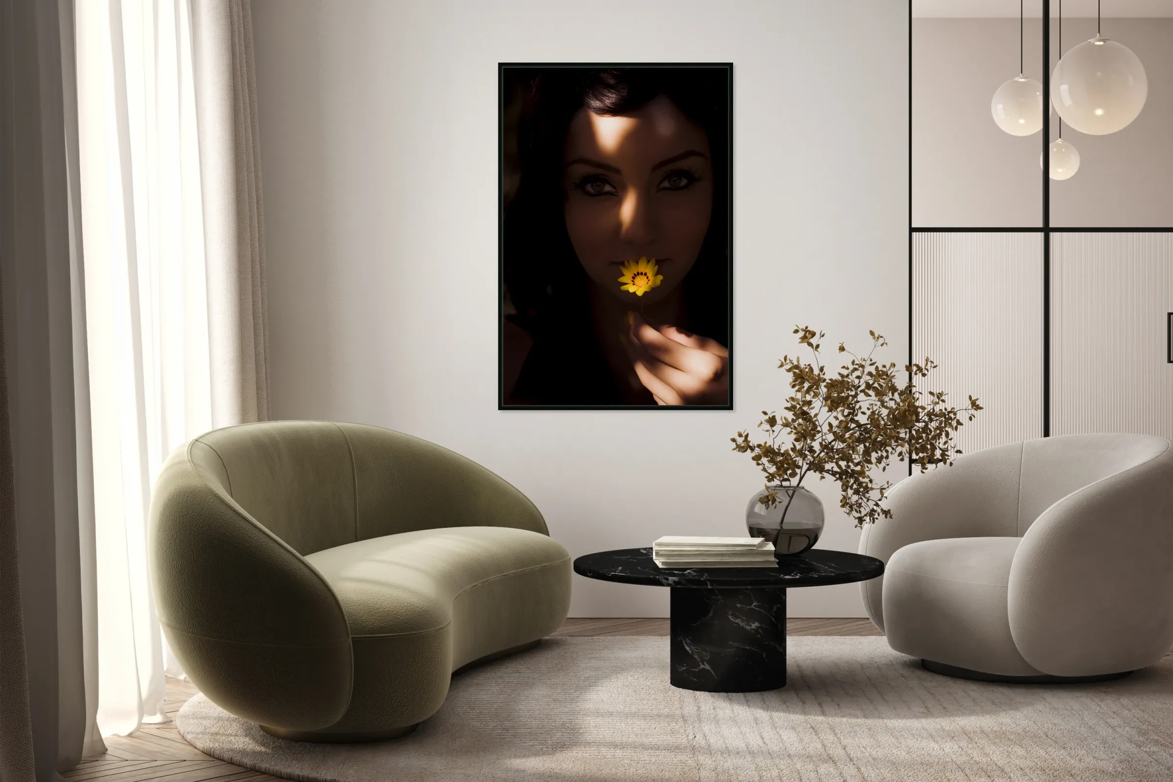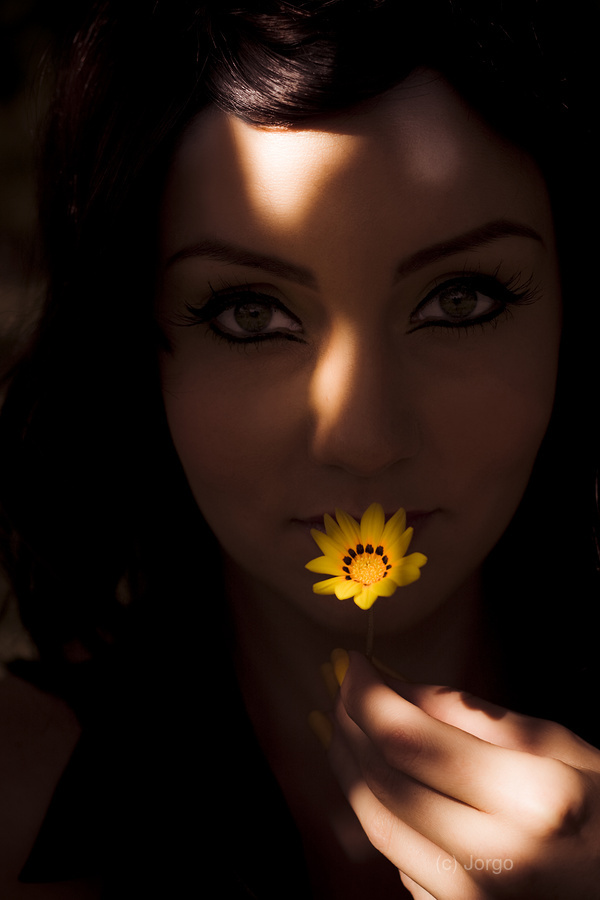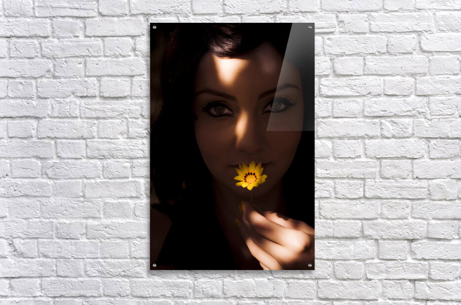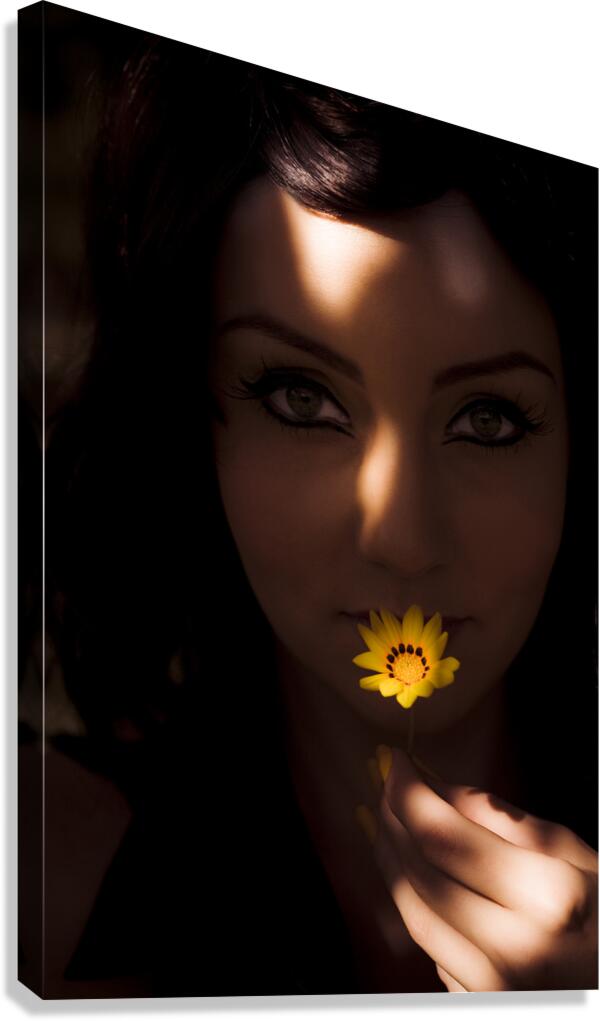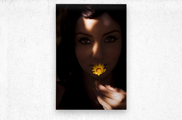 In Purity Harmony And Femininity A Woman Peering Out Of The Dimly Lit Shadows Kisses A Yellow Sun Flower Gesturing Affection Warmth And Care