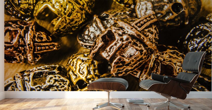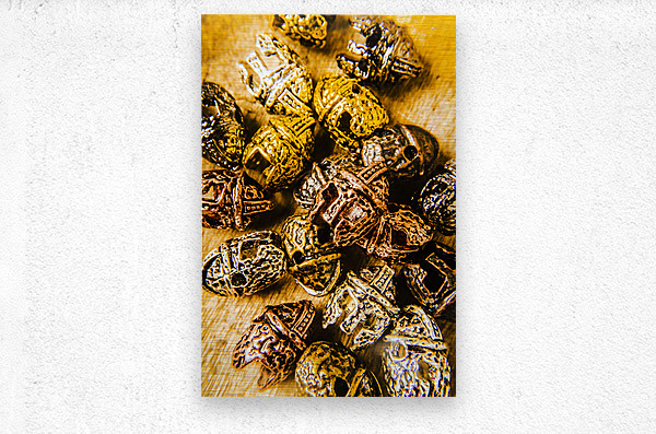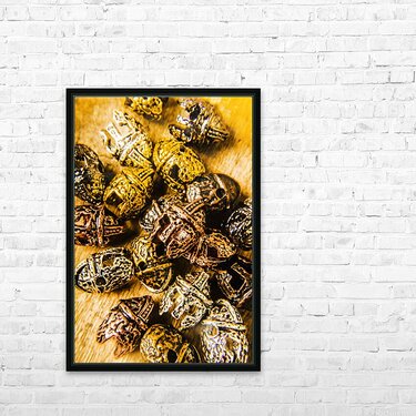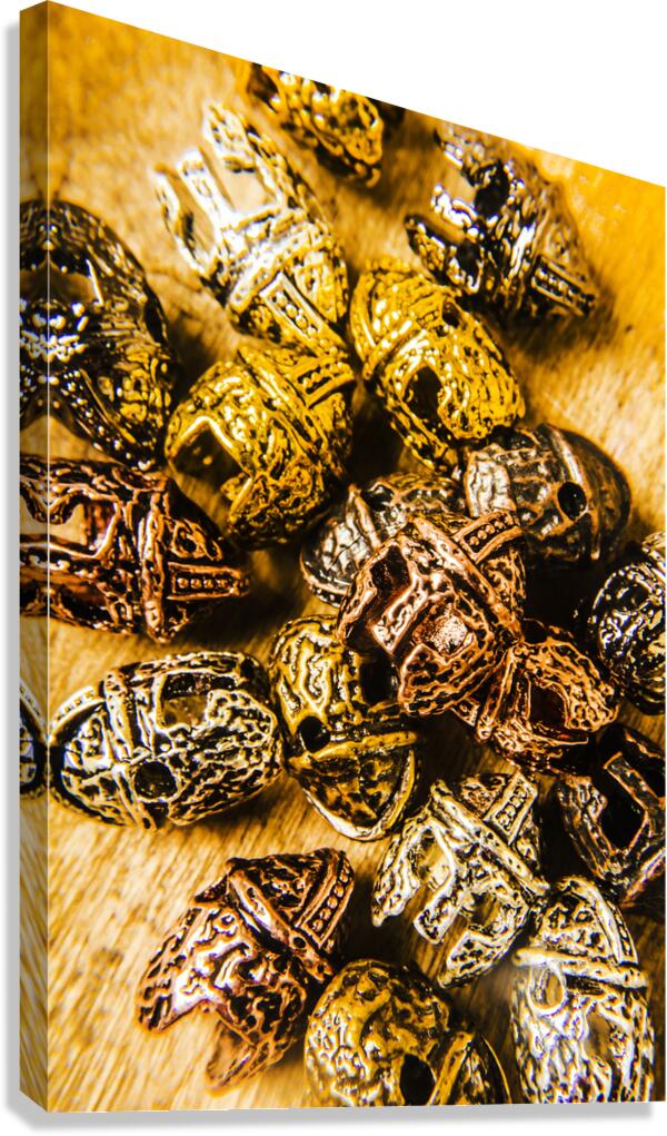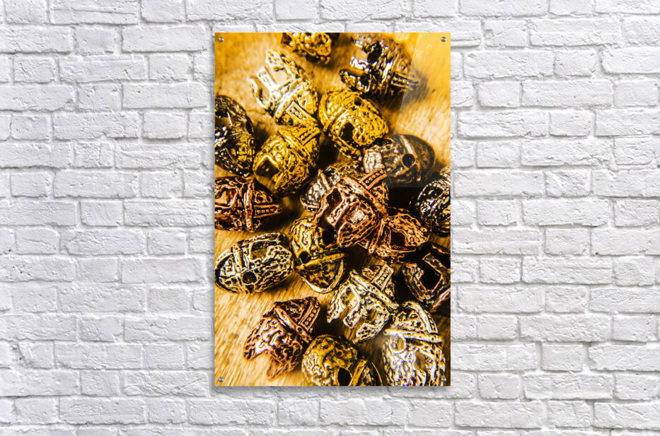Creative object artwork on a collection of scattered gladiator headgear. Roman armoury den