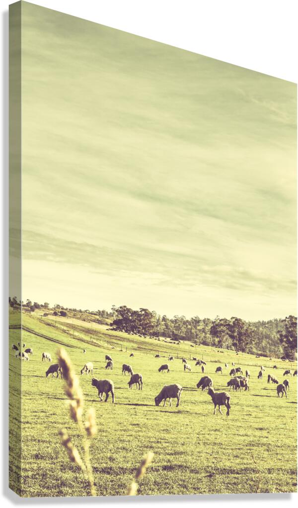 Outdoor pastel filtered scene on a herd of sheep grazing in a rustic Richmond paddock Tasmania Australia