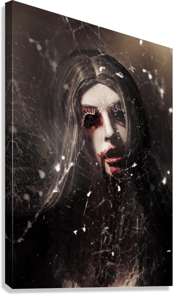 Get this artwork "Female face of dark horror. Eye of the black widow" in a framed print.