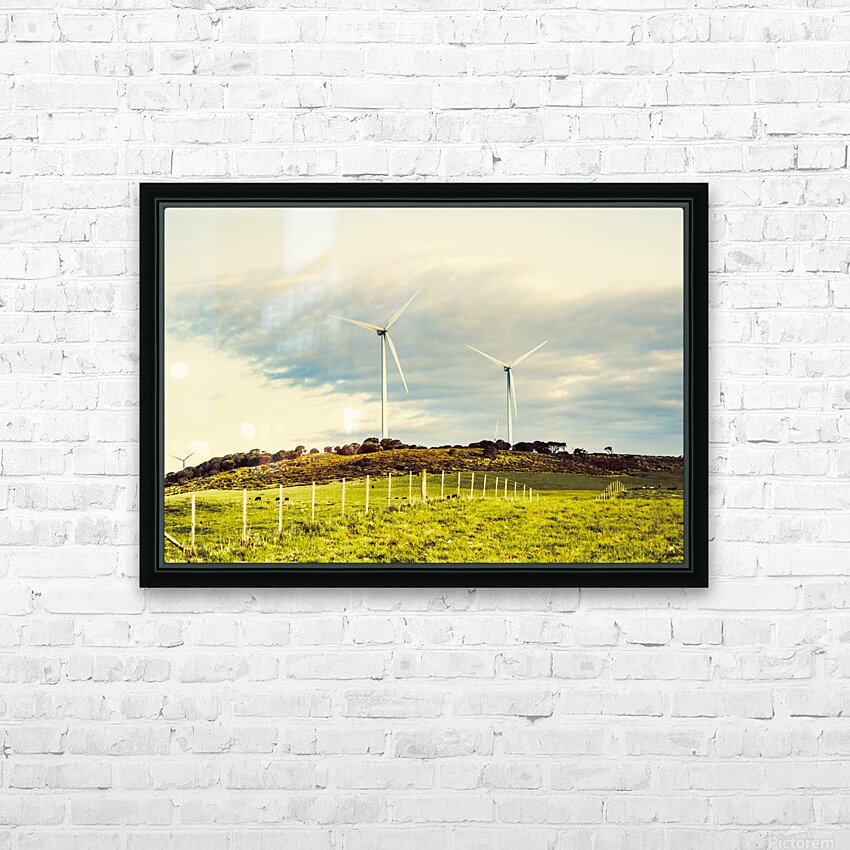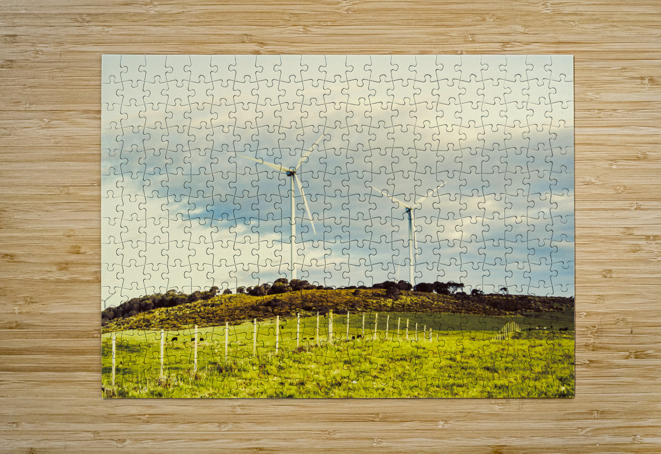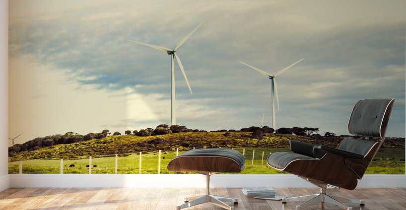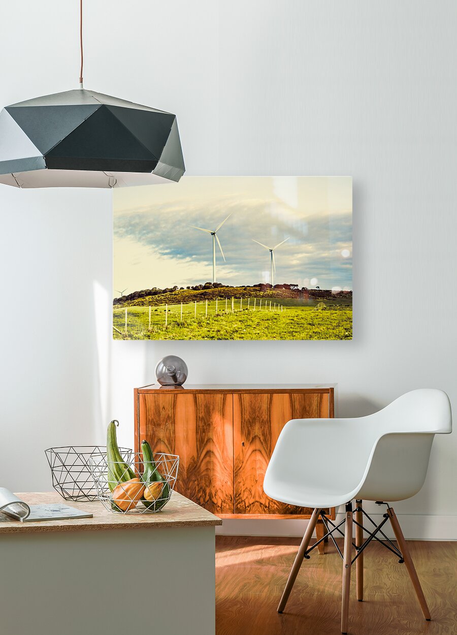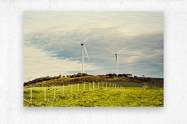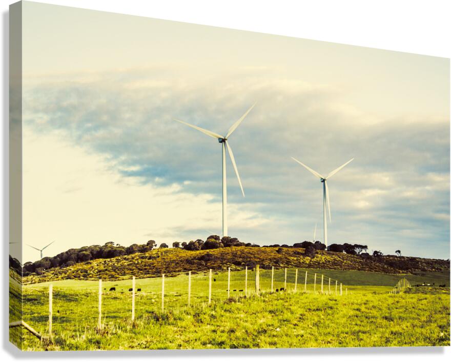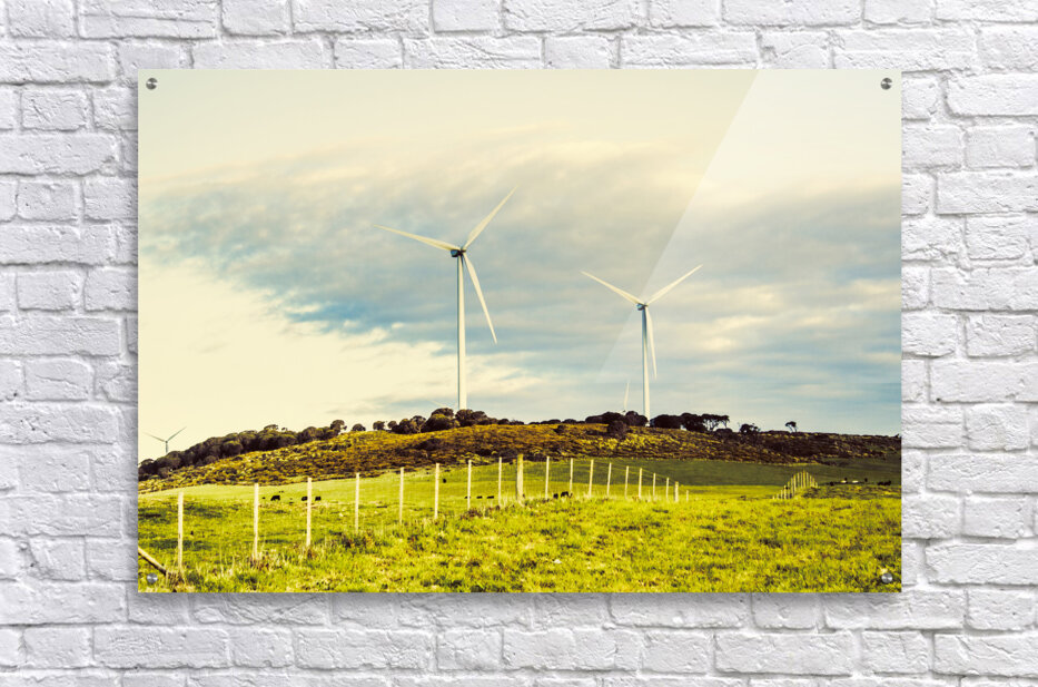Country scene of renewable energy with turbines along farming fences. Musselroe Wind Farm Cape Portland Tasmania Australia
