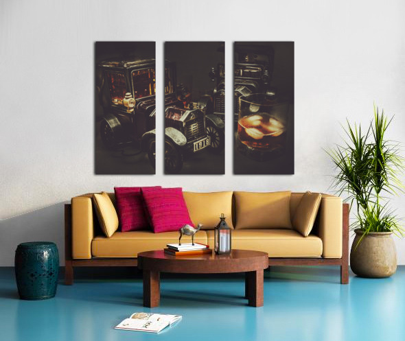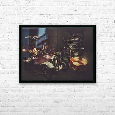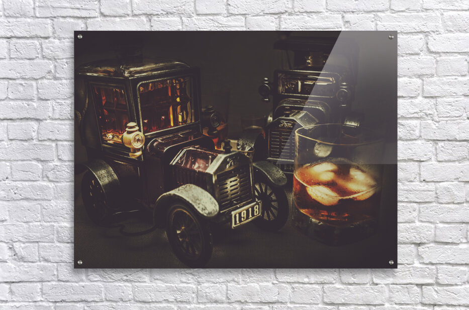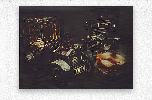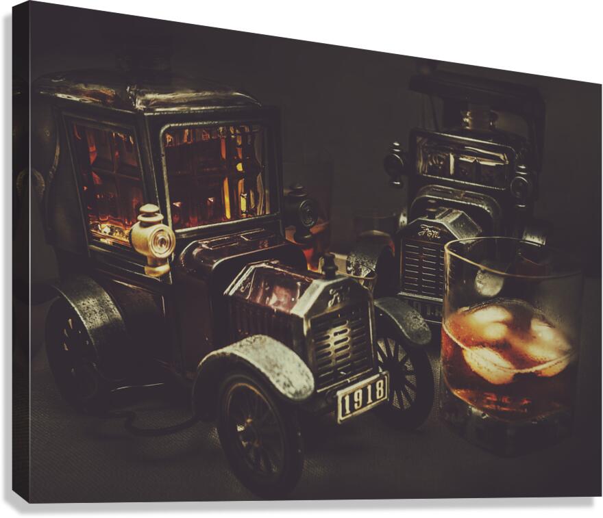 Old-fashioned dark distillery scene on ornamental flagon wagons serving up whiskey refreshments. Car club