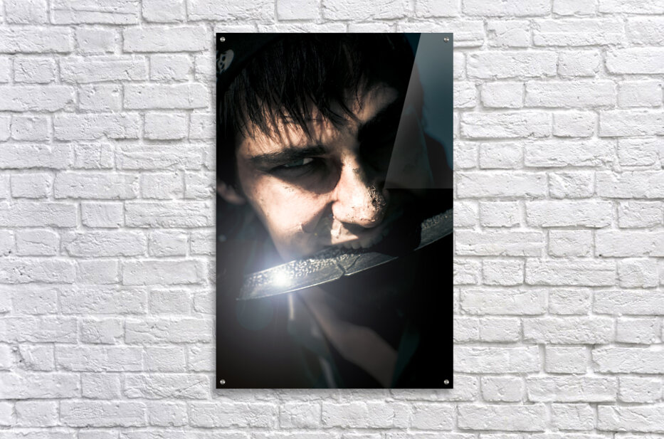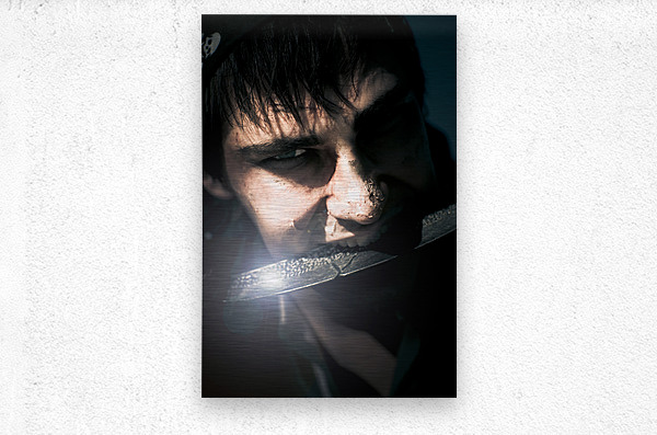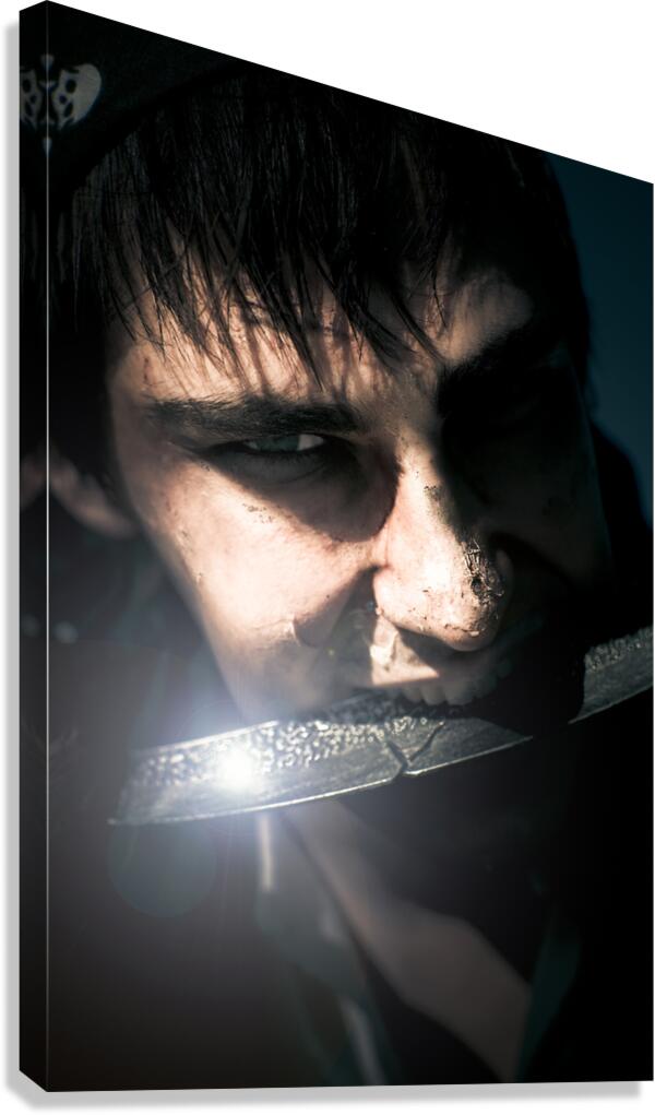 Terrifying Horror Face Portrait Of A Scarred And Blistered Pirate Biting On A Razor Sharp Sword Blade In A Frightening Fear And Danger Concept