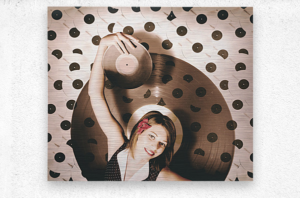 Vintage pin-up girl holding old LP when spinning vinyl discs at a vintage radio station. Rock around the clock