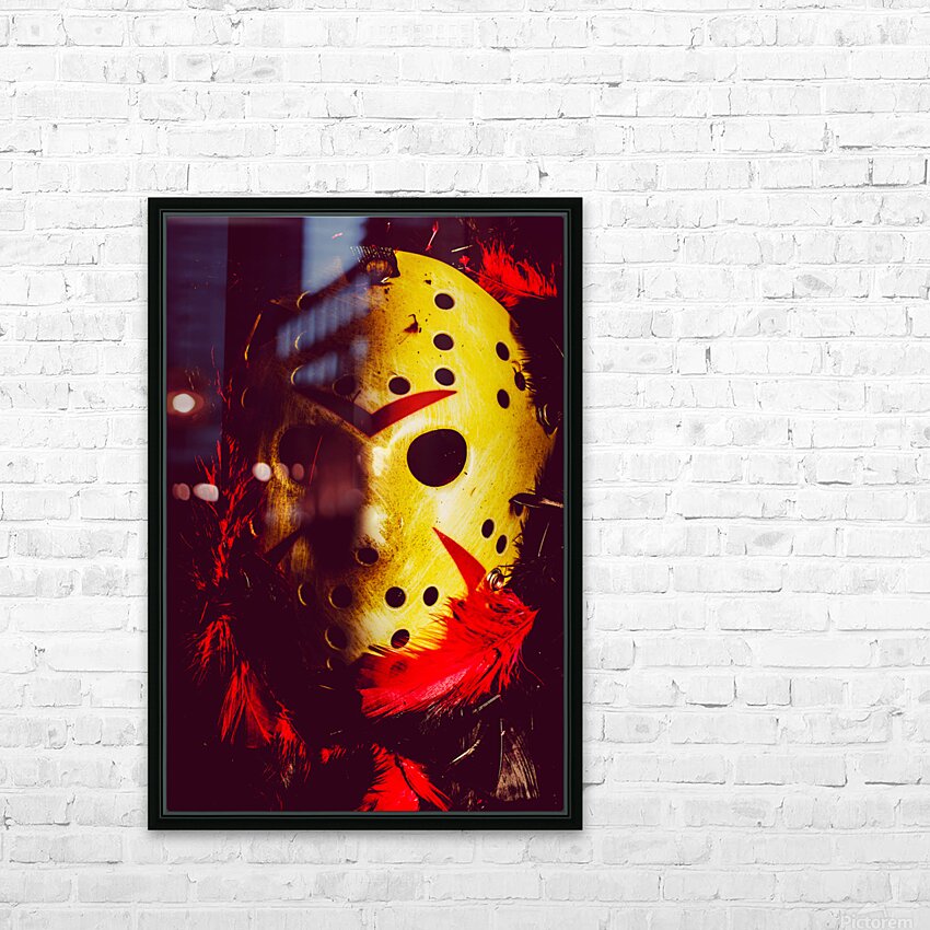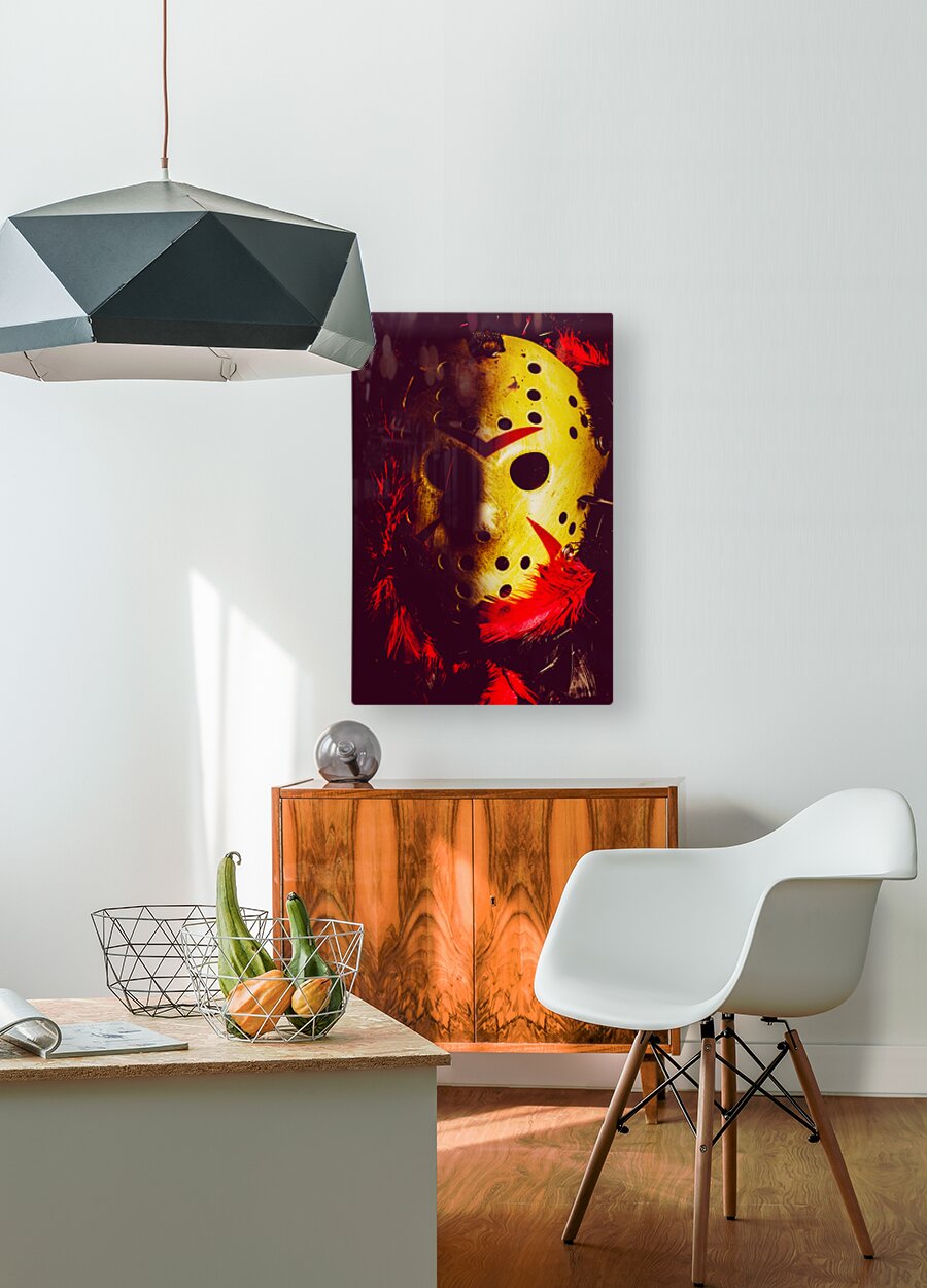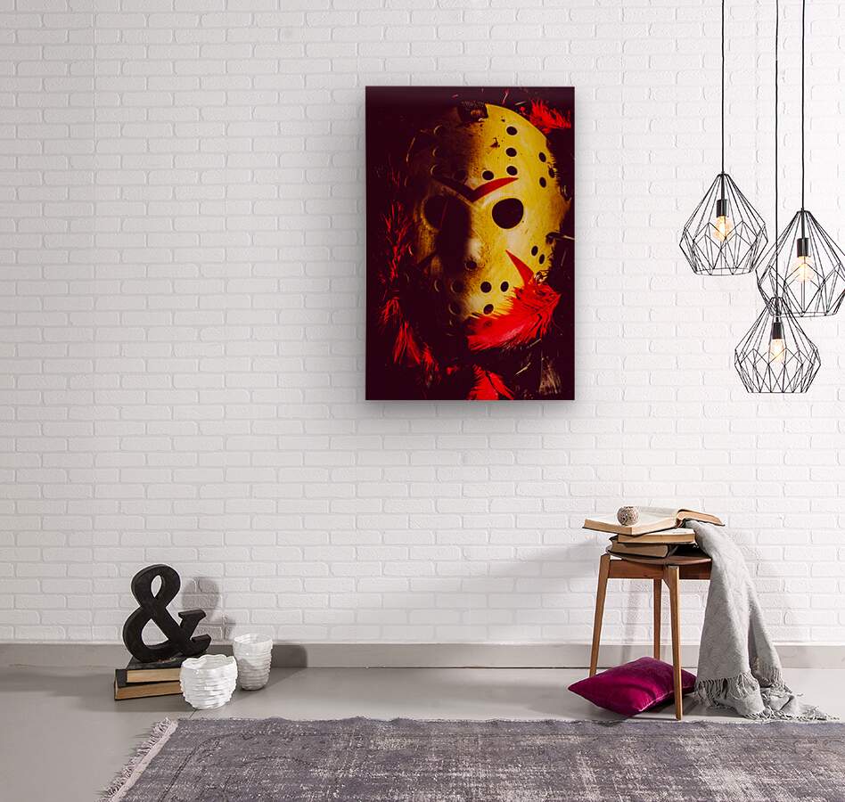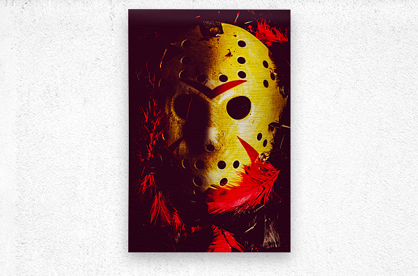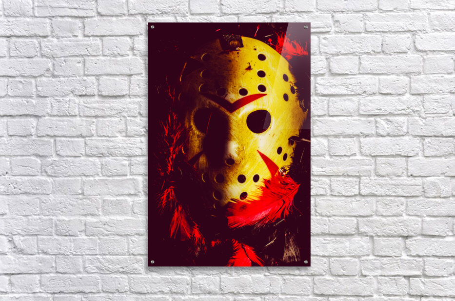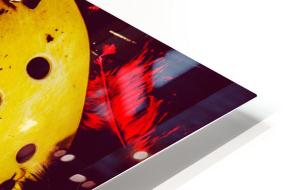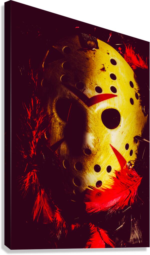 Retro tone fright night terror with a dark foreboding ice hockey mask veiled by stained red feathers. A cinematic nightmare
