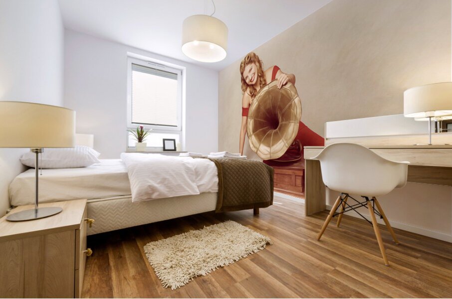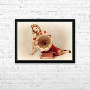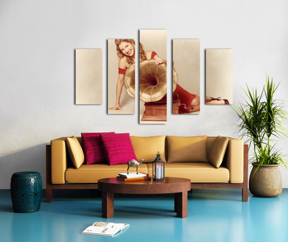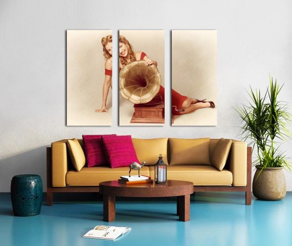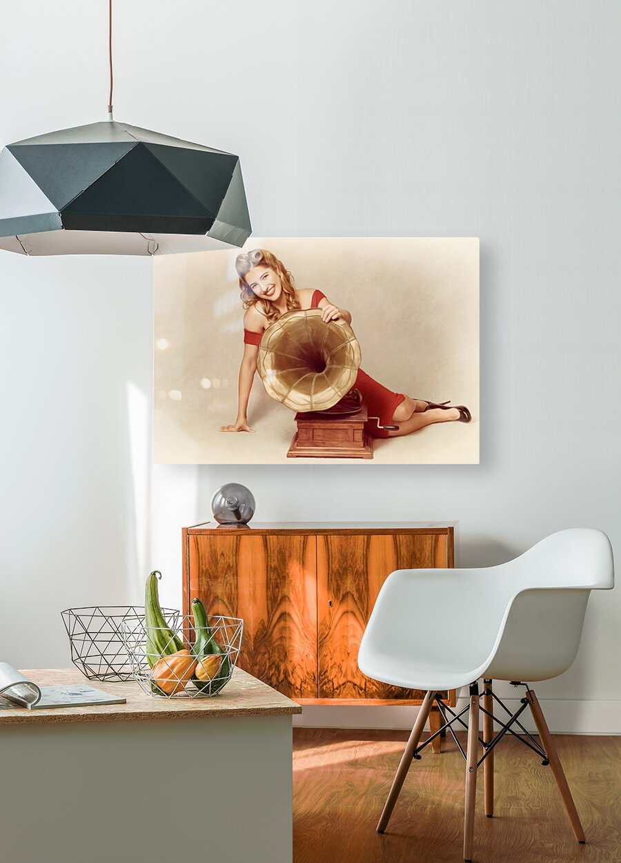 ABOUT THIS ARTWORK: 60S PIN UP GIRL WITH VINTAGE RECORD PHONOGRAPH