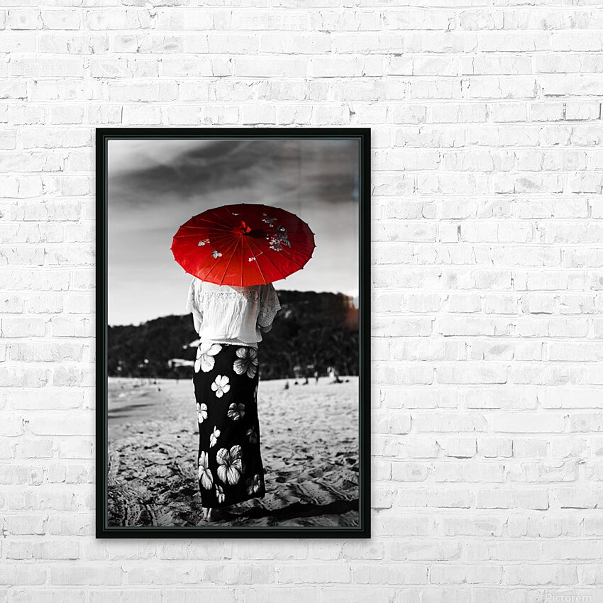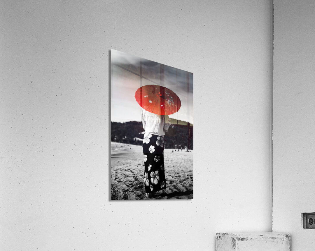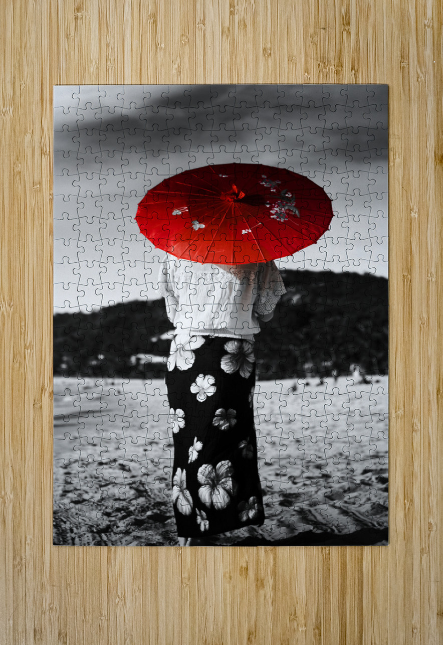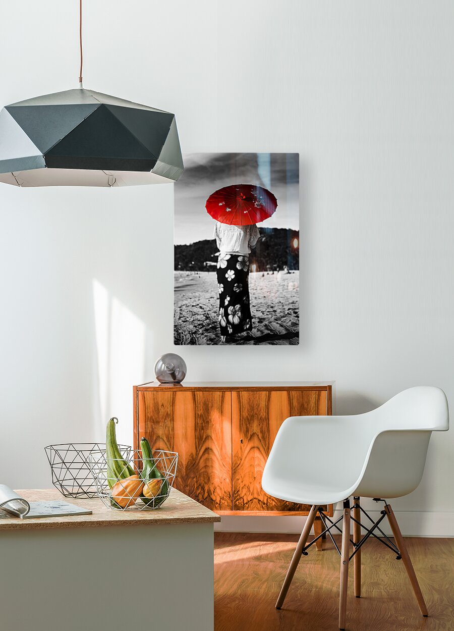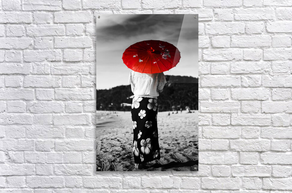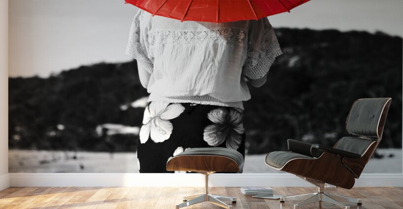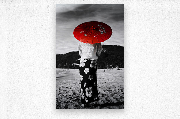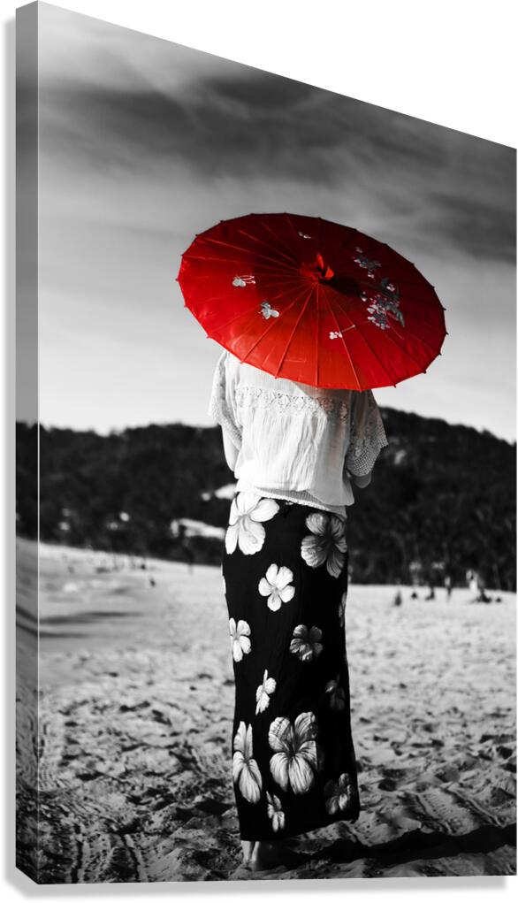 Black and white image of an Asian person walking away across a sandy beach wearing a floral sarong and carrying a parasol in red selective colouring