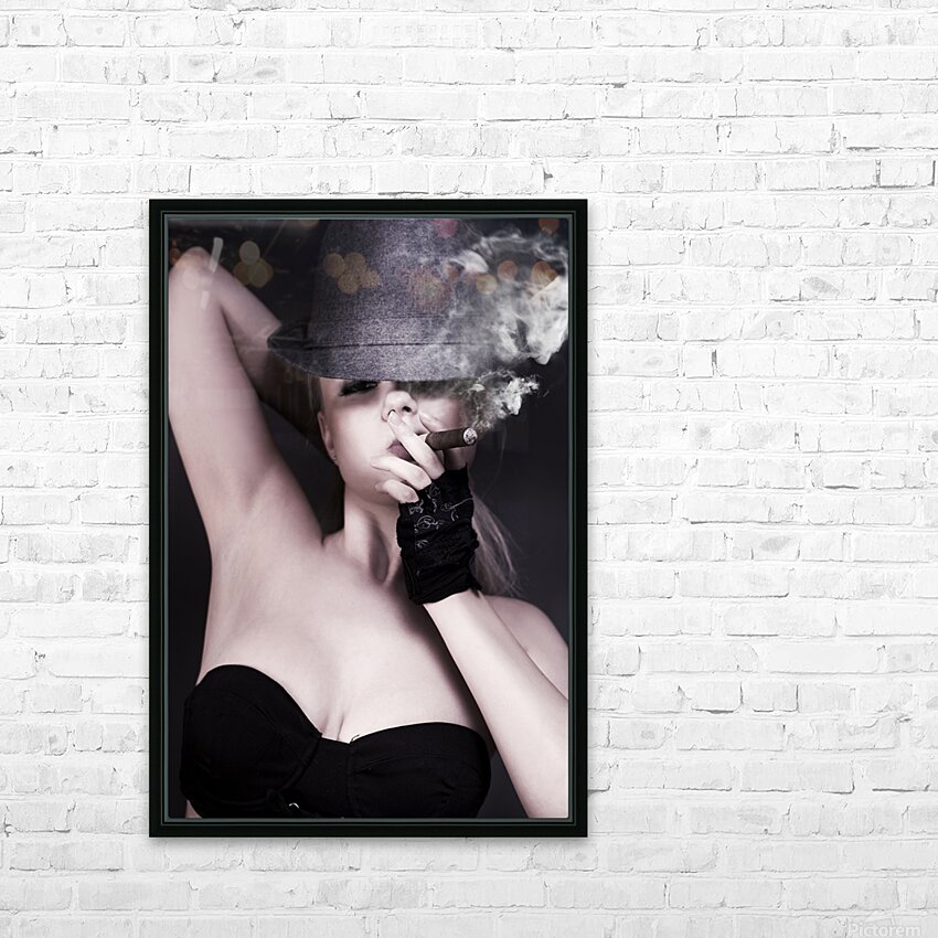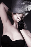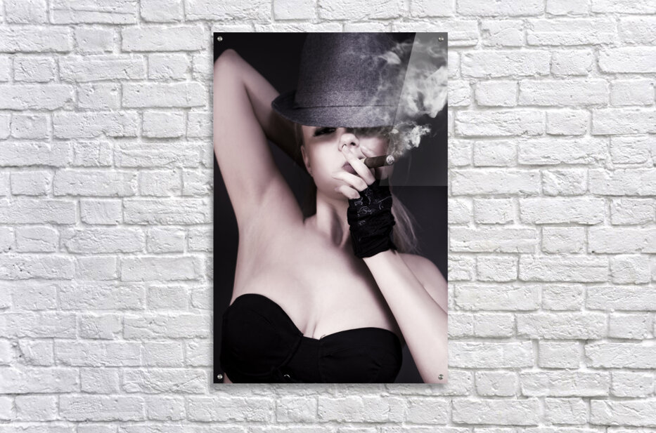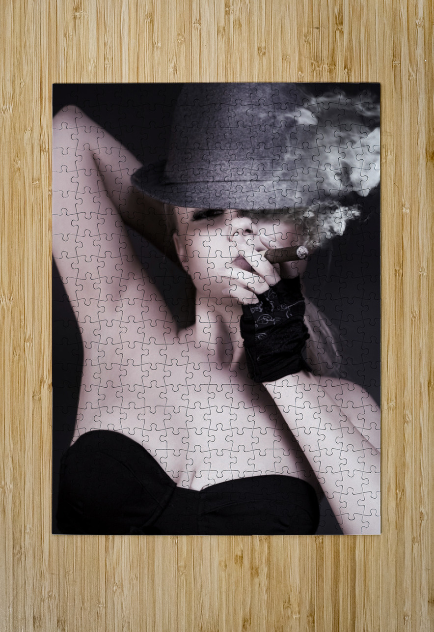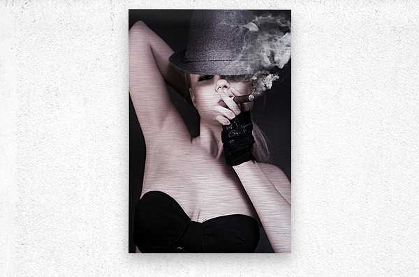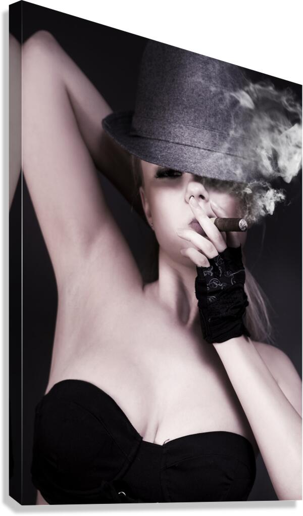 Low angle portrait of a glamorous female private eye detective puffing on a large cigar in mysterious style