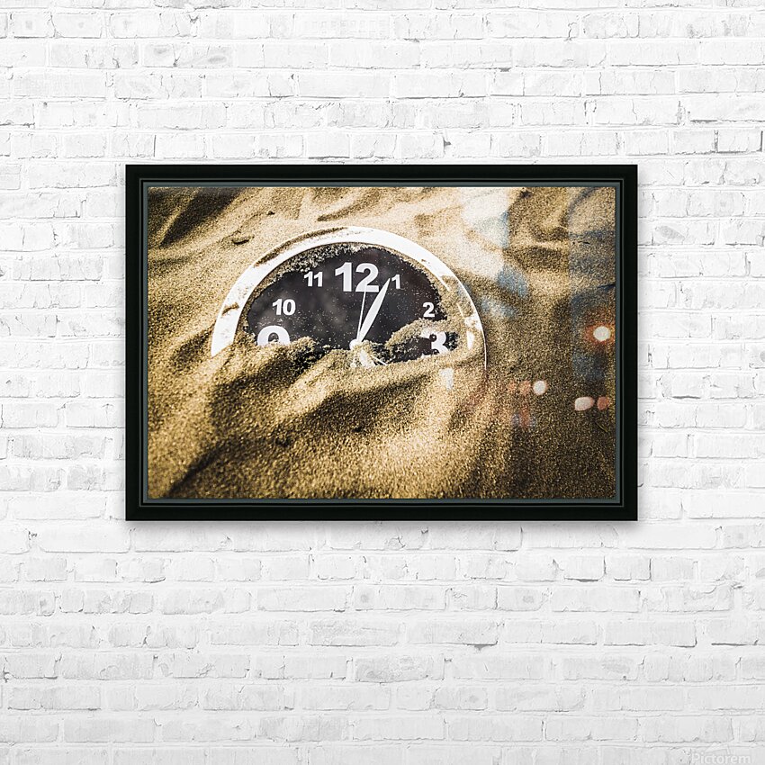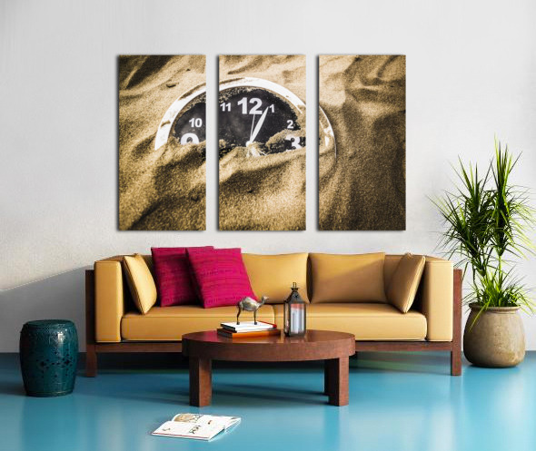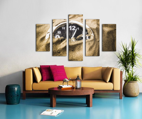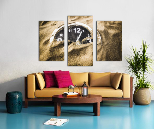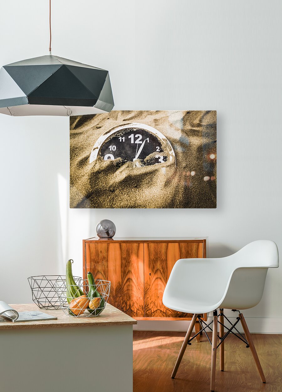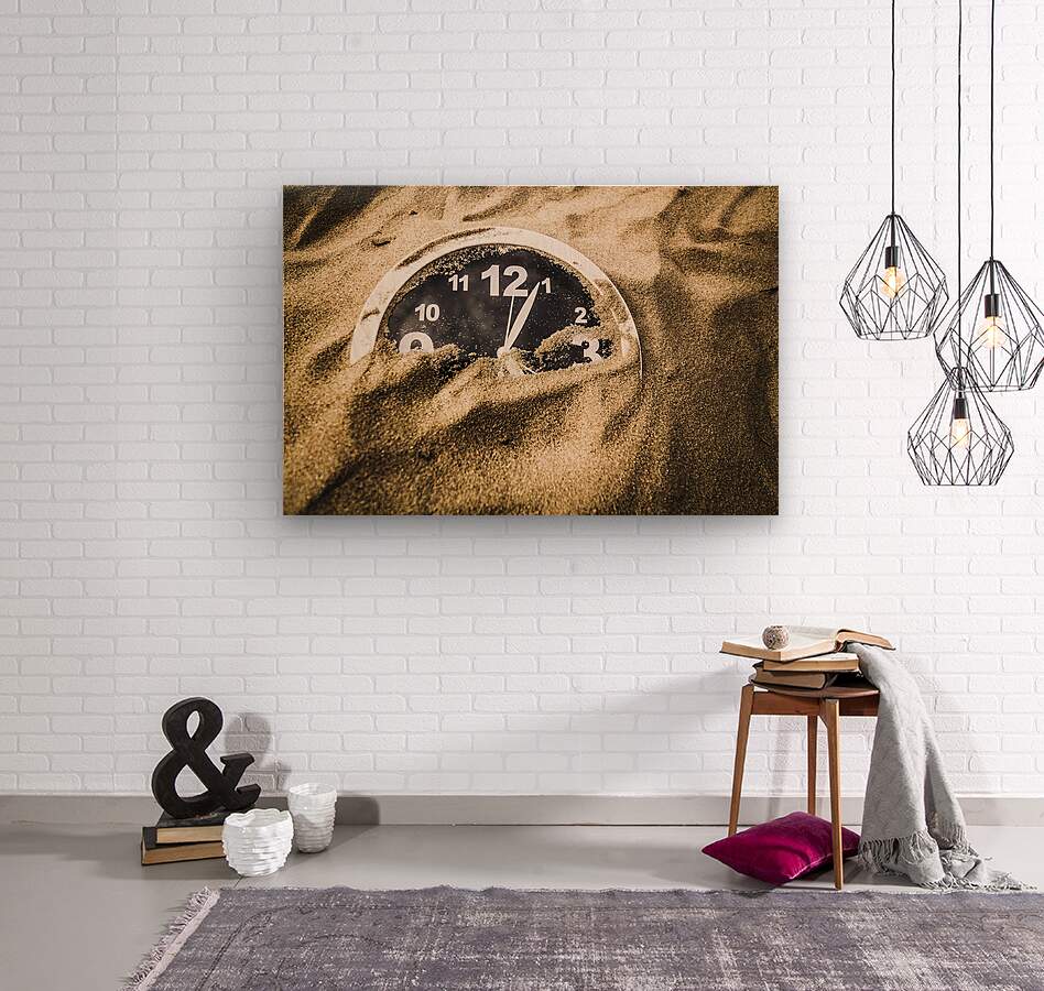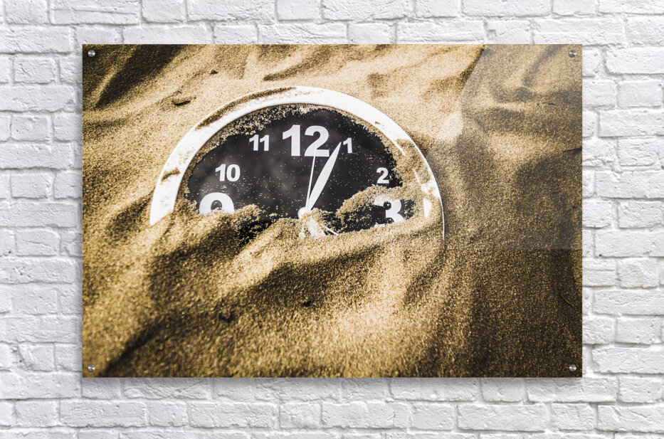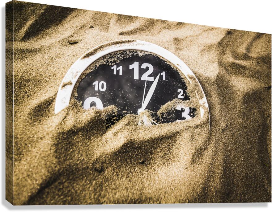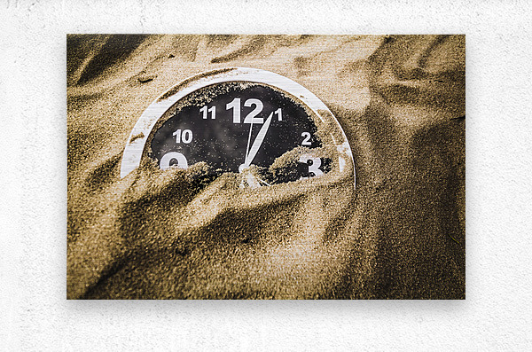Close still-life photo on a sand covered clock buried on a desert plain. Deserted in time