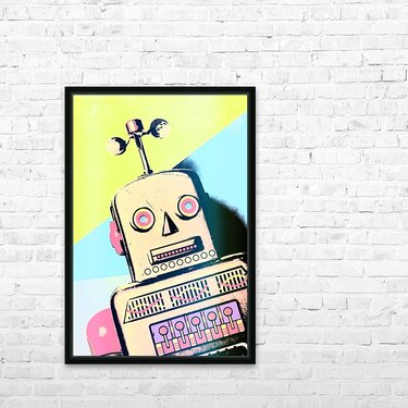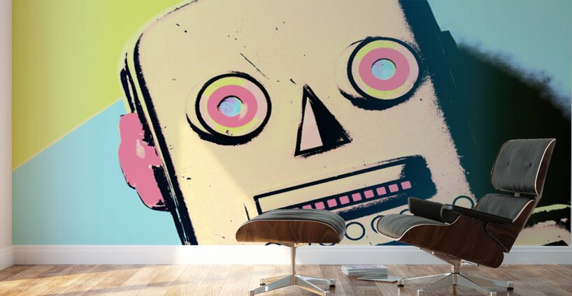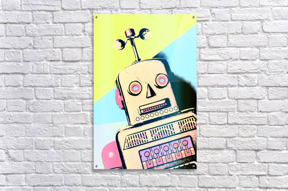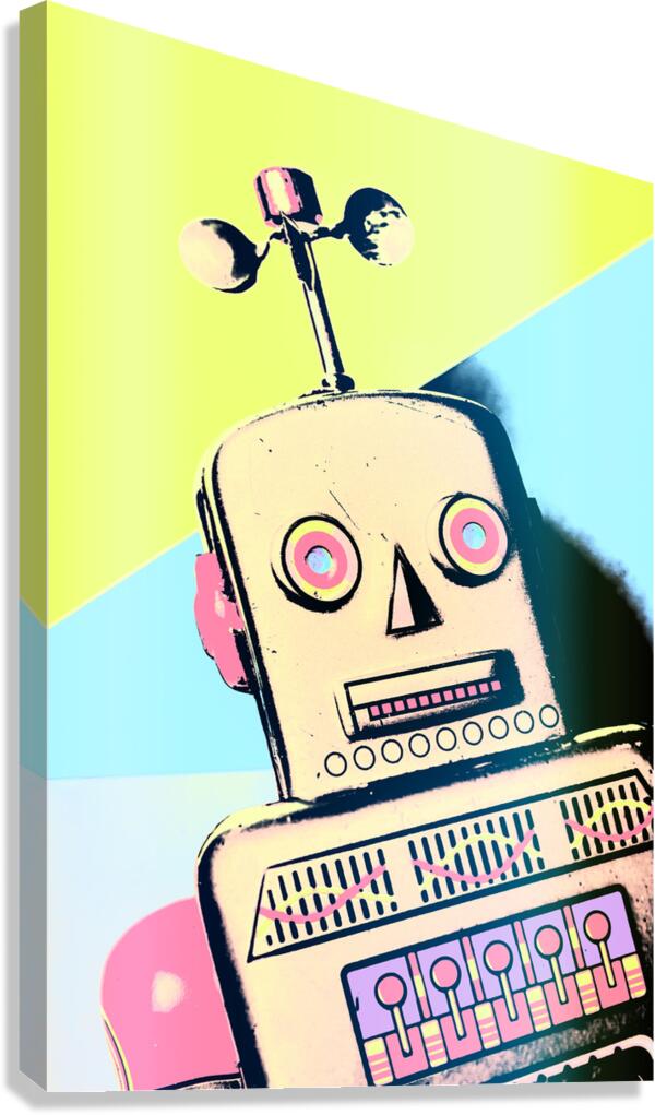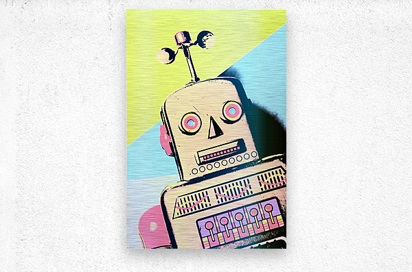 Cartoon photo art on a retro robotic face from comic machine play. Spaced out