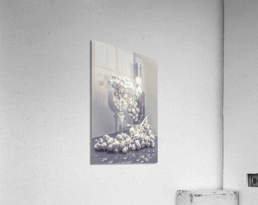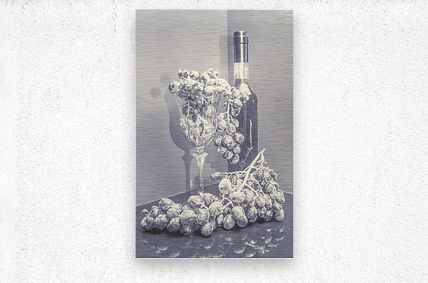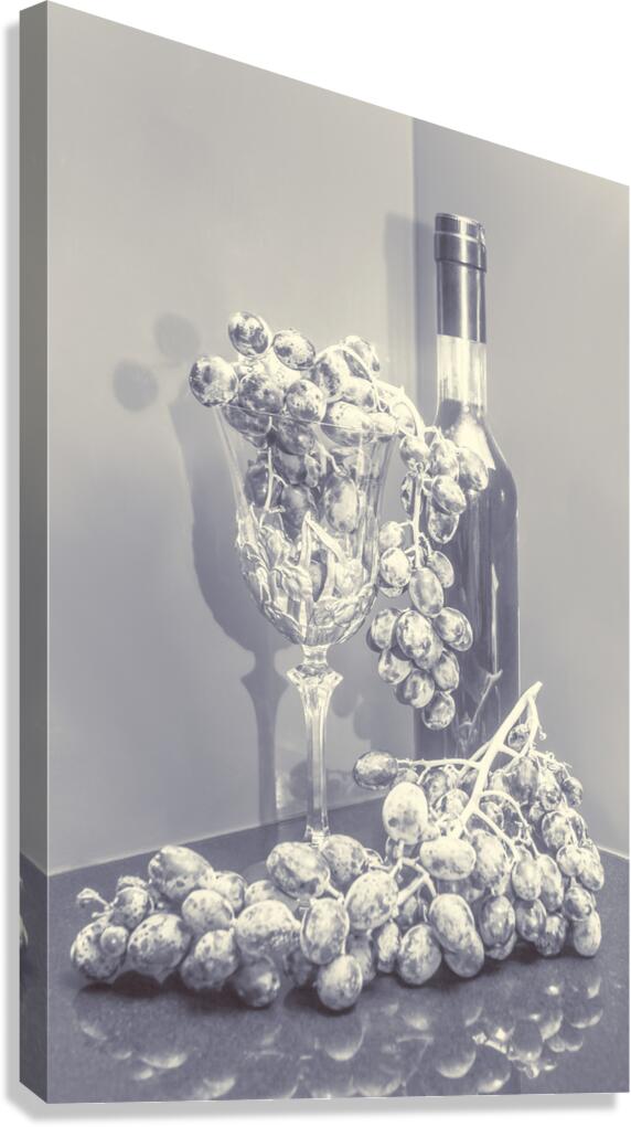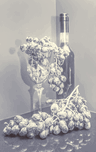 Classical stylised still life art on a bunch of grapes and red wine in reflective luxury. A grape gala