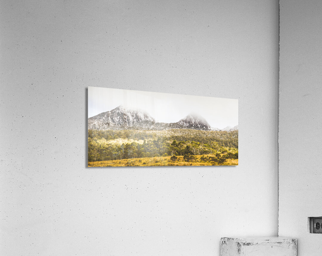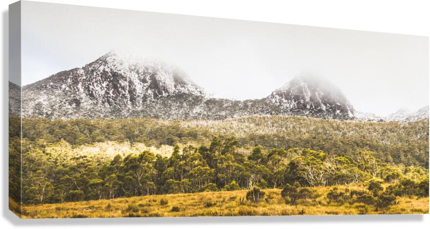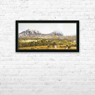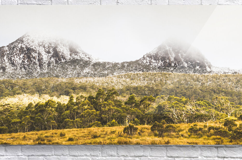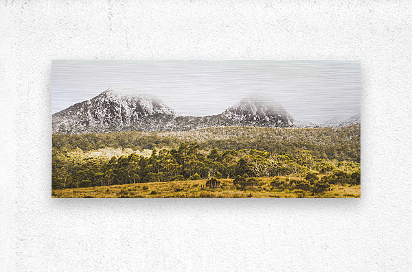 Layered landscape scene with expansive wide views to snow covered mountain terrain. King William Range Derwent Bridge Tasmania Australia