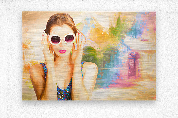 Fine art digital sketch of an adorable summertime woman wearing bright and colourful fashion at outdoor beach vista. Watercolur pinup swimmer