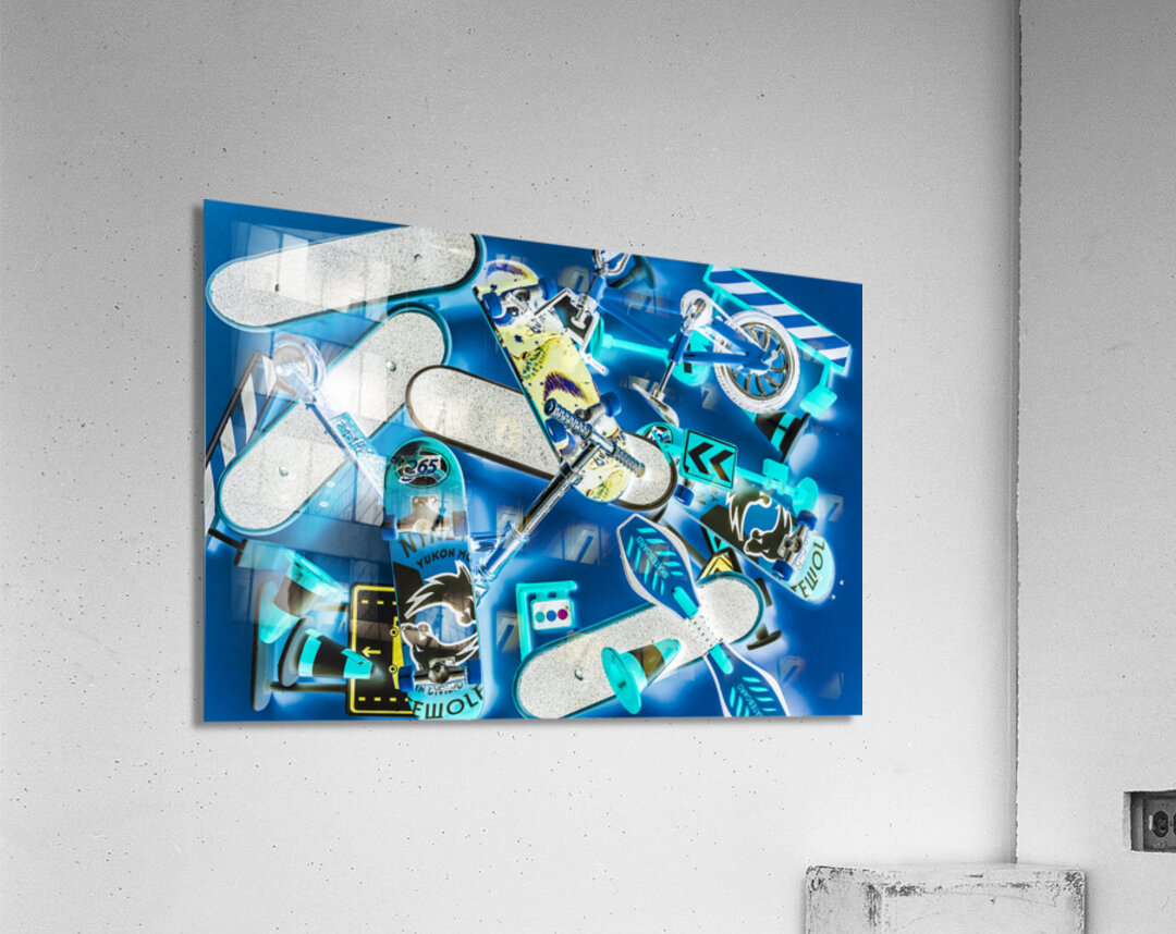 Street signs and road sports equipment stacked in abstract play. Abstacked