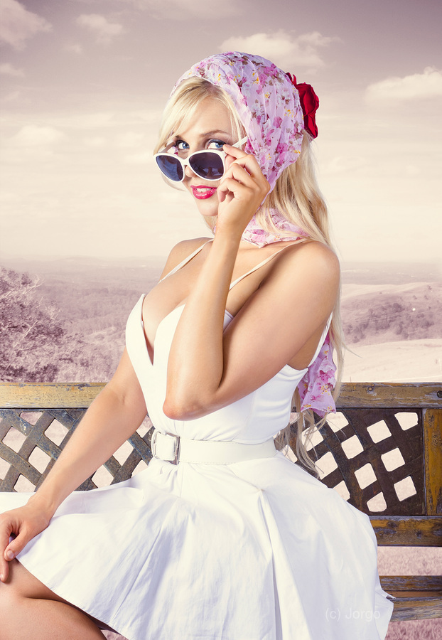 Stunning retro fashion woman sitting on a bench at a beautiful autralian location. Fifties Australian fashion style