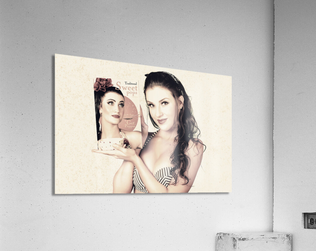 Old style commercial of a beautiful retro pinup girl advertising a mock up box of breakfast cereal in a depiction of past sales and marketing. Vintage pop art advertising