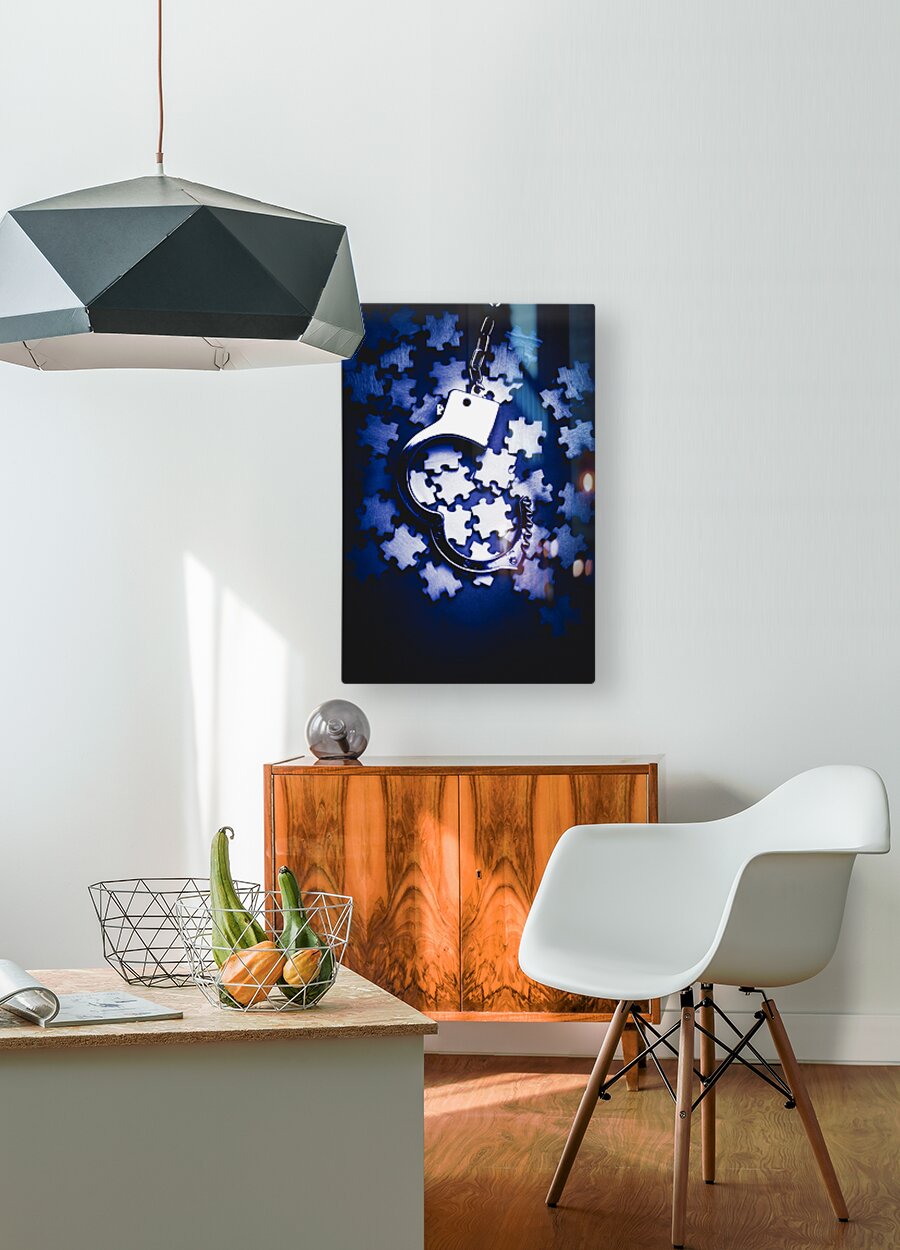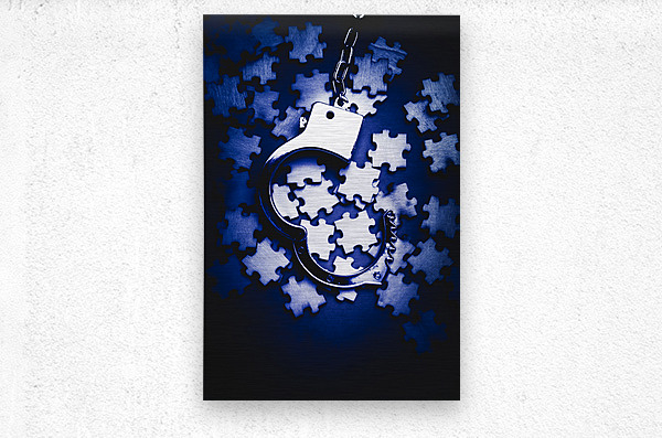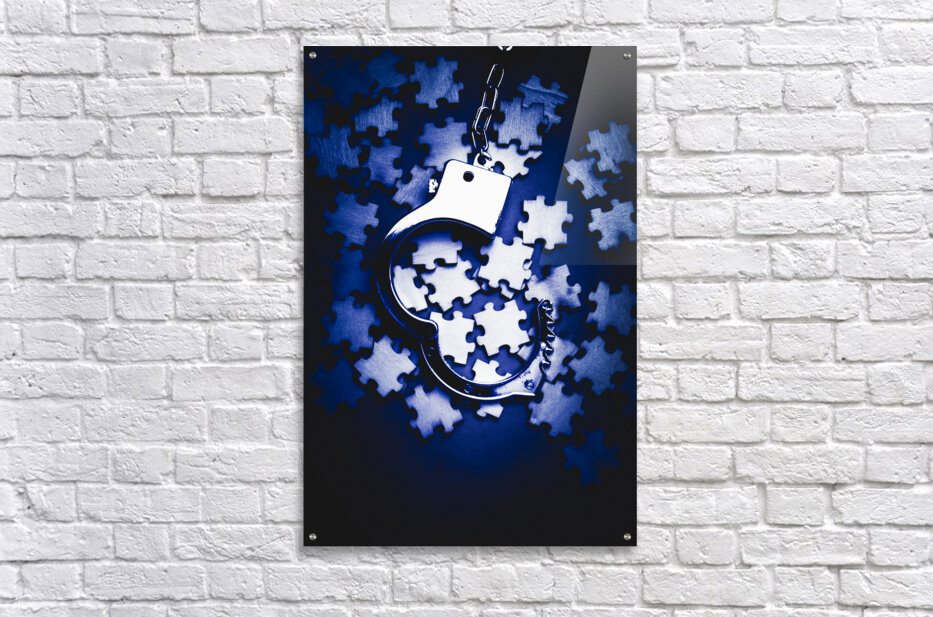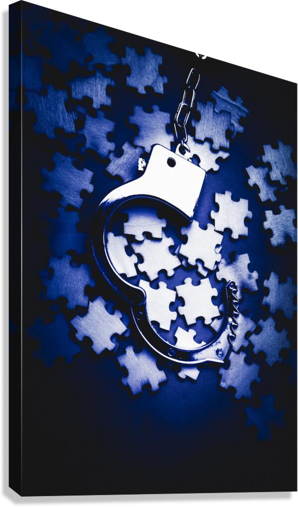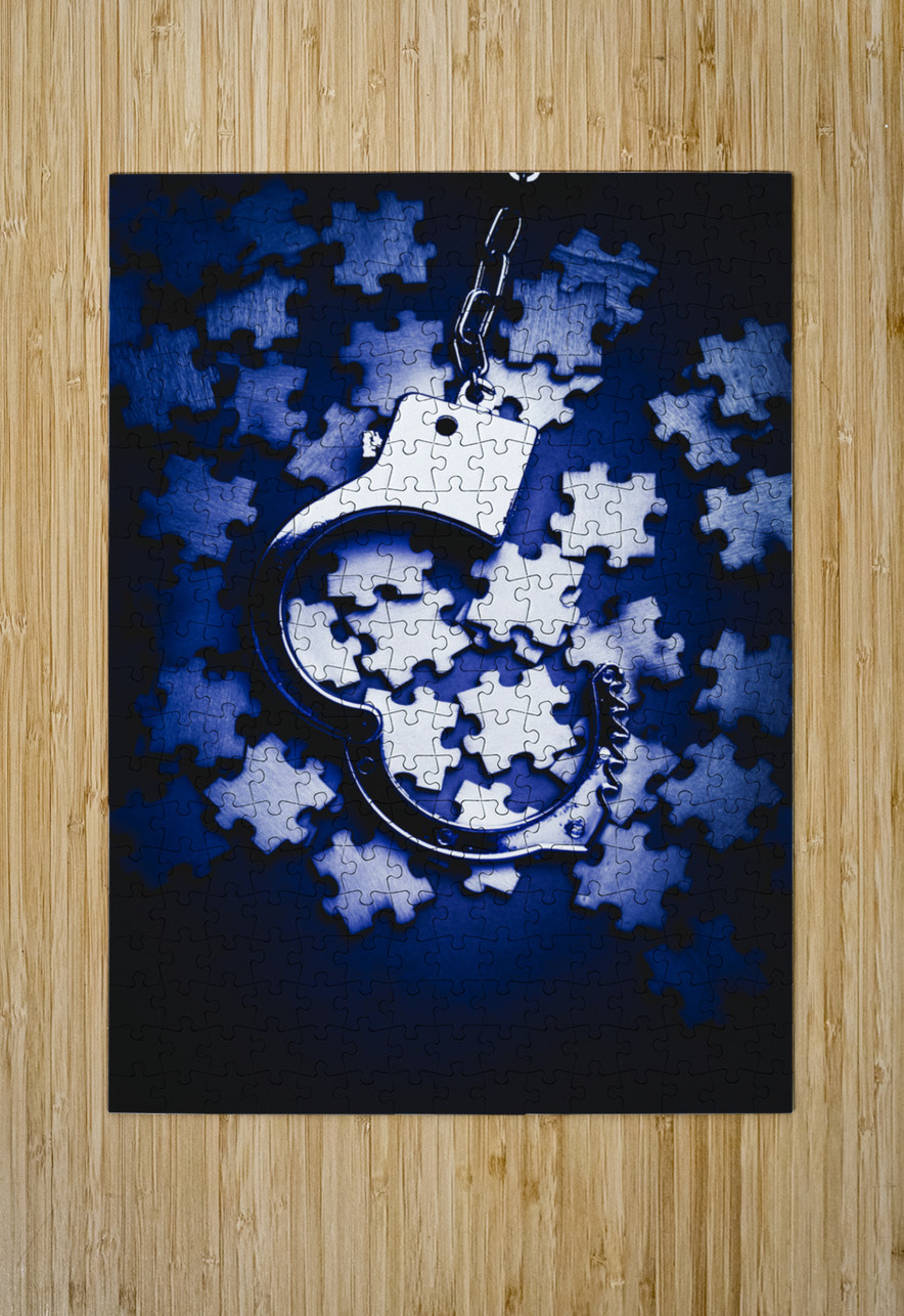 Blue toned still life photo on a scattering of jigsaw puzzles pieces with open cuffs. Open case mystery