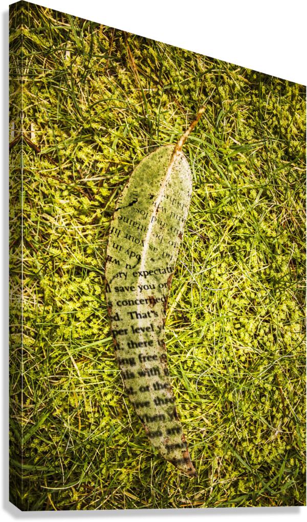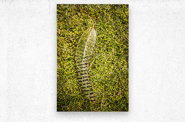 Wise words written on a fall autumn leaf laying on green grass field. Natures secret code