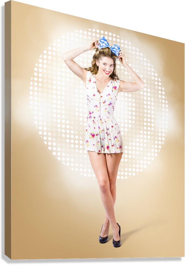 Get this artwork "Modelling pinup girl wearing bow hair accessory" in a framed print.