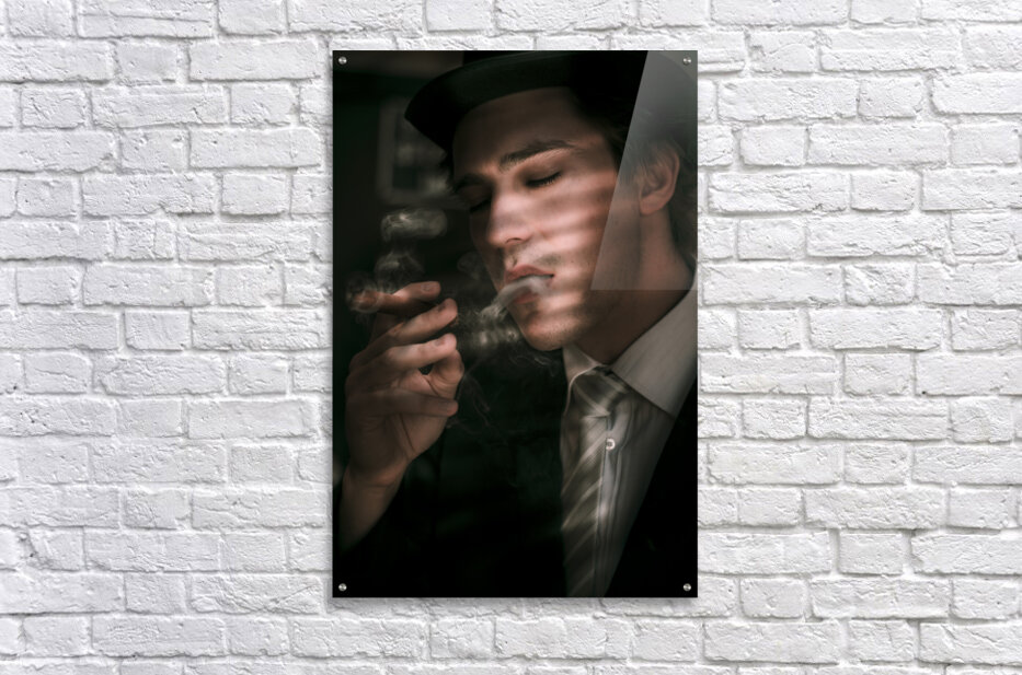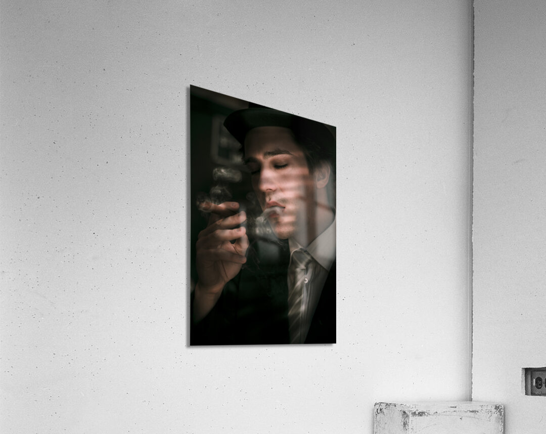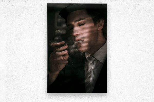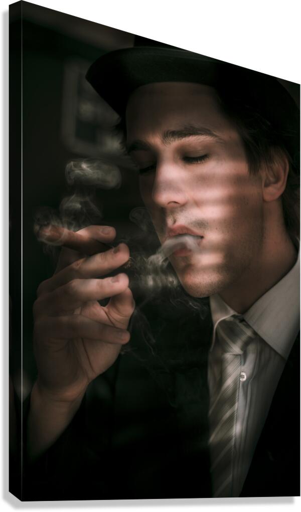 Creative Art Design Portrait Of An Old Fashion Male Sixties Detective Wearing Business Suit While Smoking Cigar In Dark Office With Blinds Closed