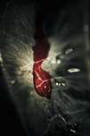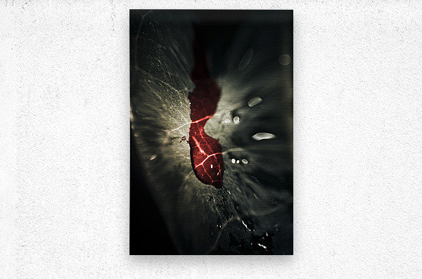 Distorted image of a blood droplet running down a leaf at a forest location leaving a trail of clues to a who done it murder mystery. Crime scene inve...[+]