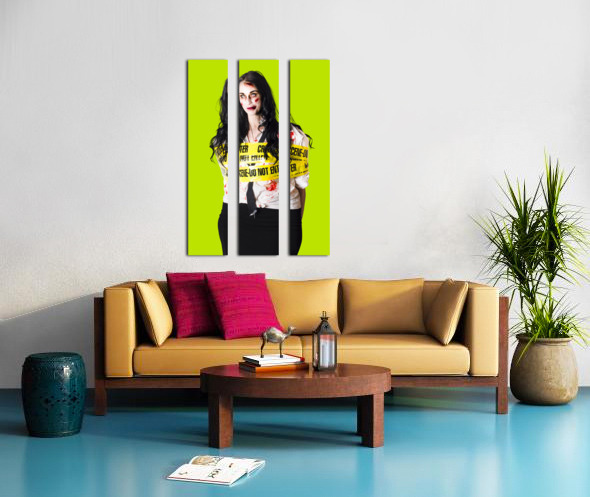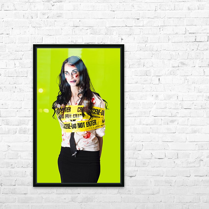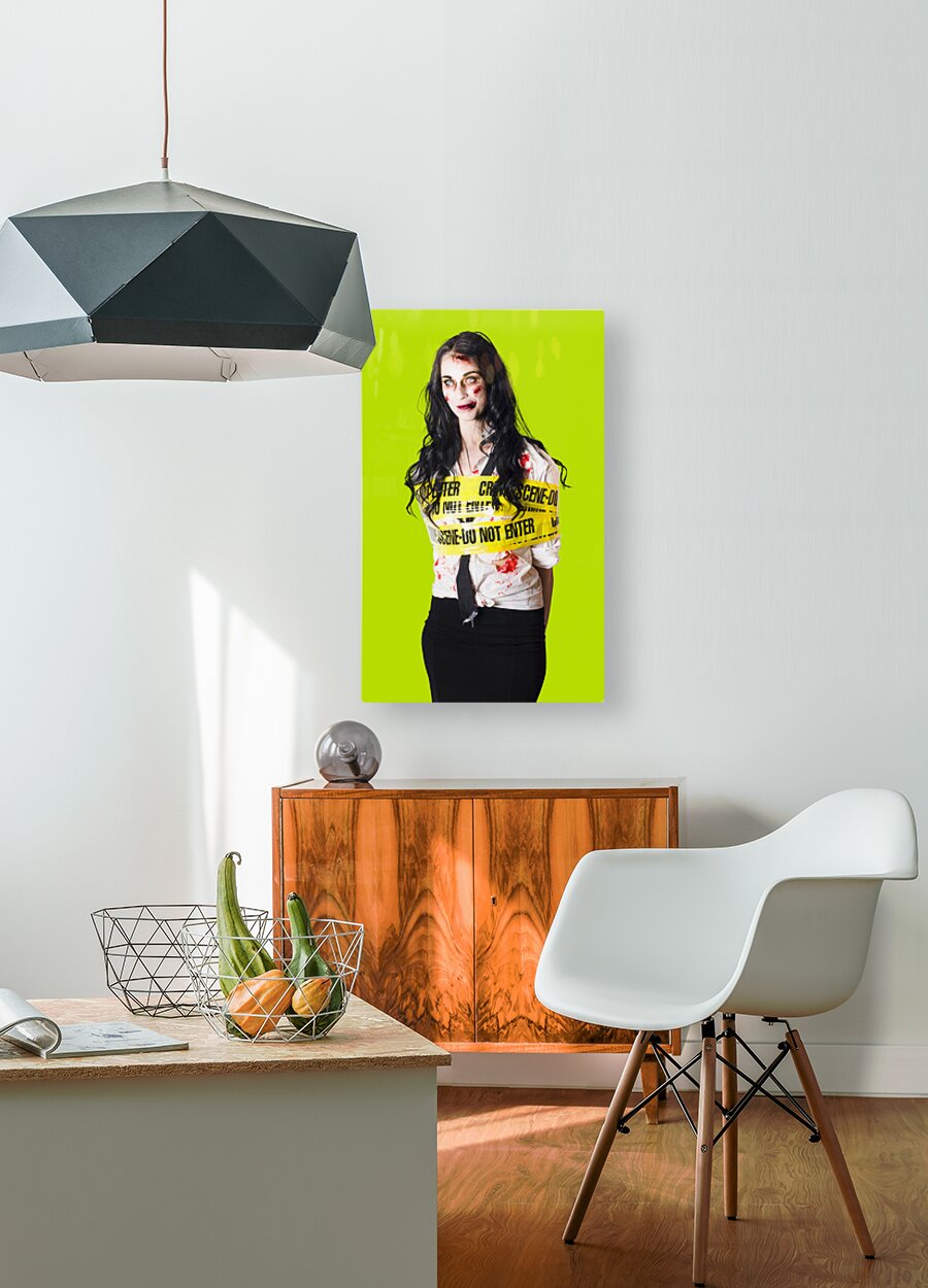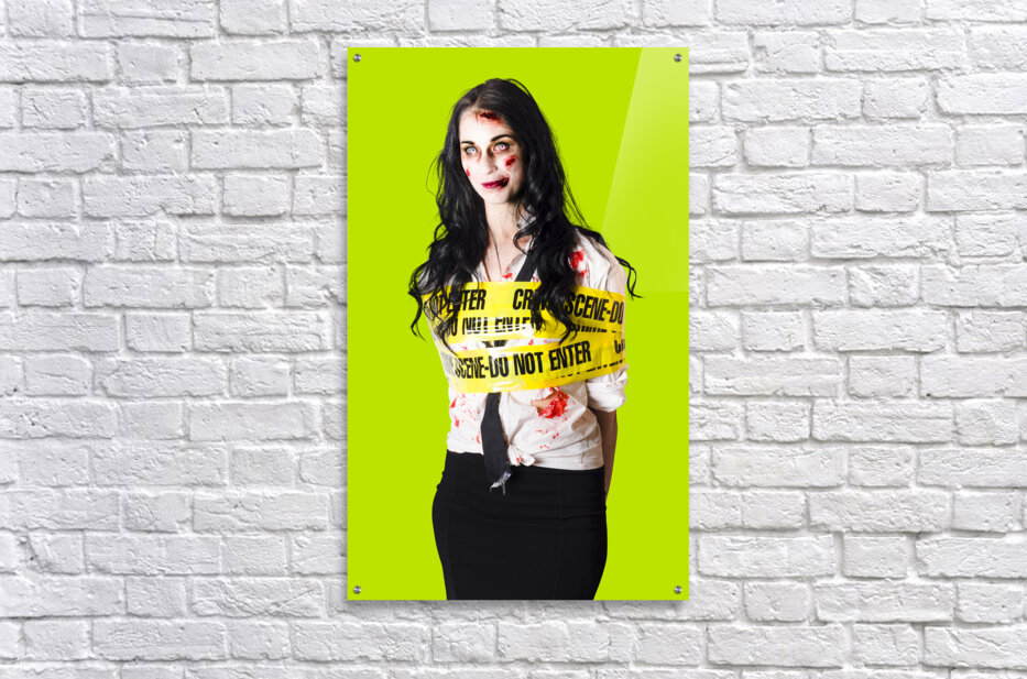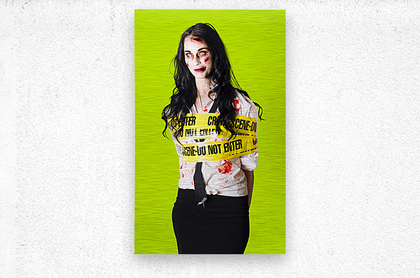 Zombie woman bleeding and injured at crime scene bound up with wide yellow tape isolated on white background