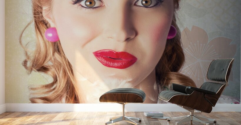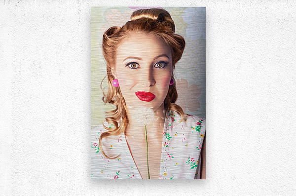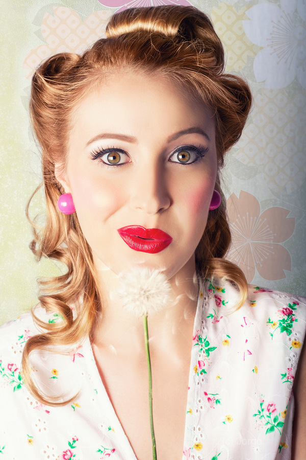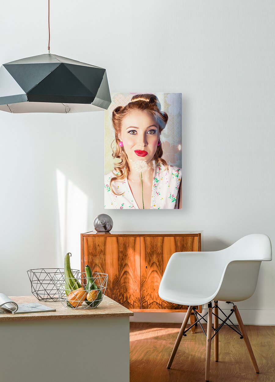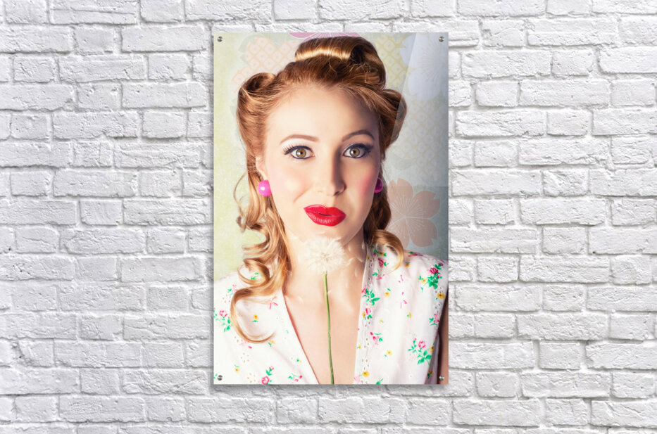 Beautiful Pinup Woman With Retro Hair Style And Makeup Blowing Seeds On A Dandelion Flower While Standing Against A Floral Wallpaper Design In A Sprin...[+]