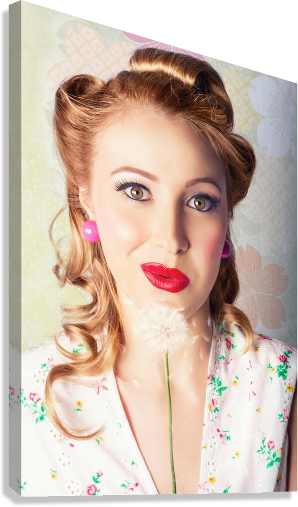 ABOUT THIS ARTWORK: SPRING BEAUTY. BEAUTIFUL RETRO GIRL BLOWING FLOWER
