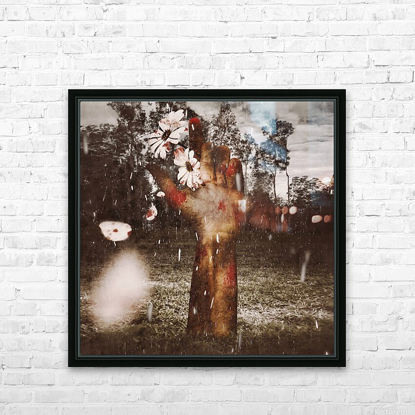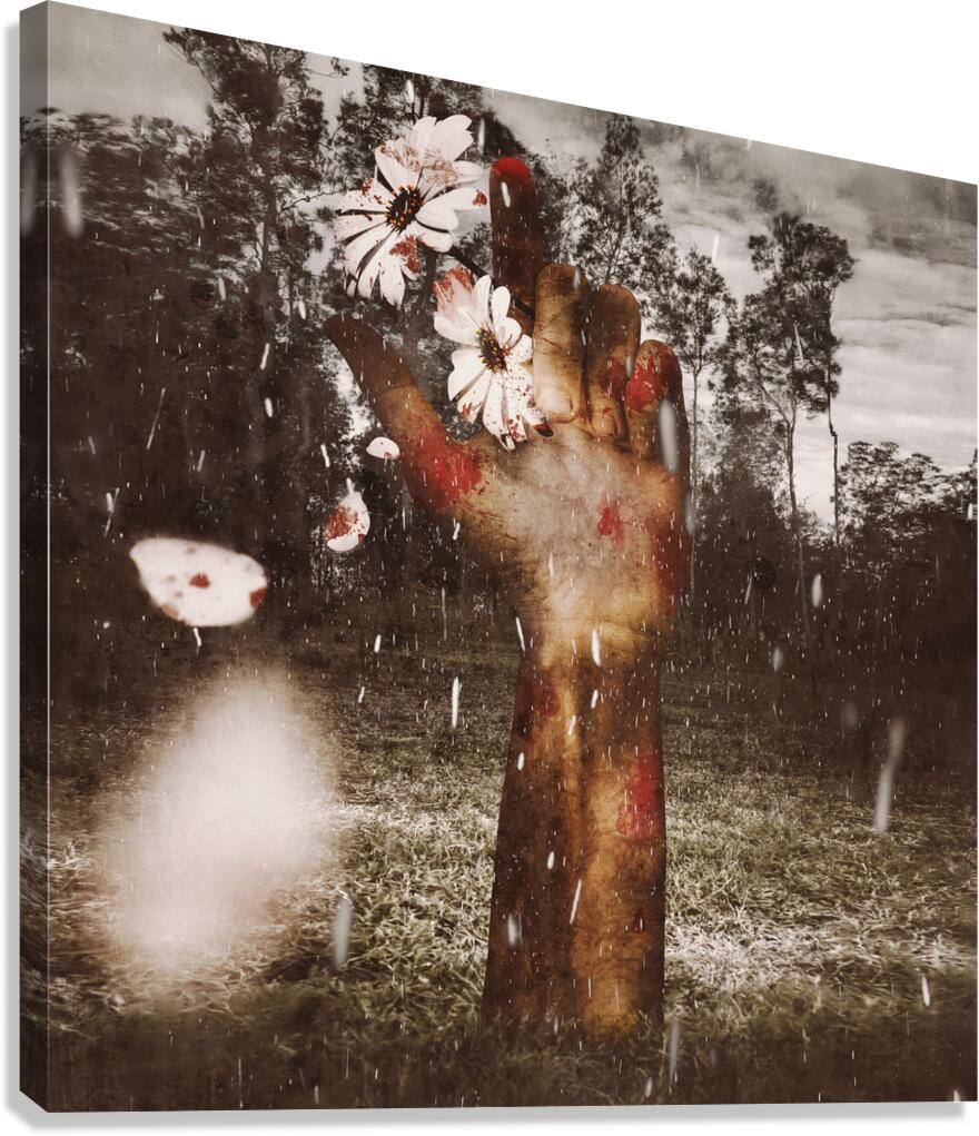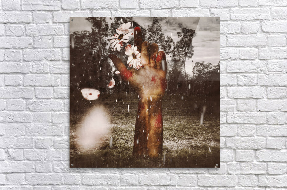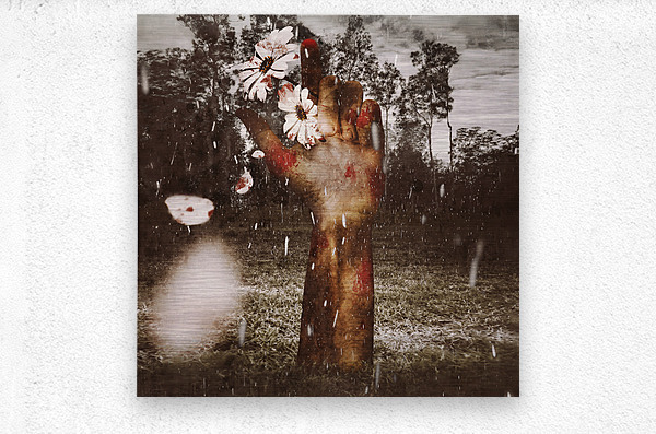 Scarred dead hand releasing a flow of flower petals when pushing up daisies in a shallow grave. In love and death