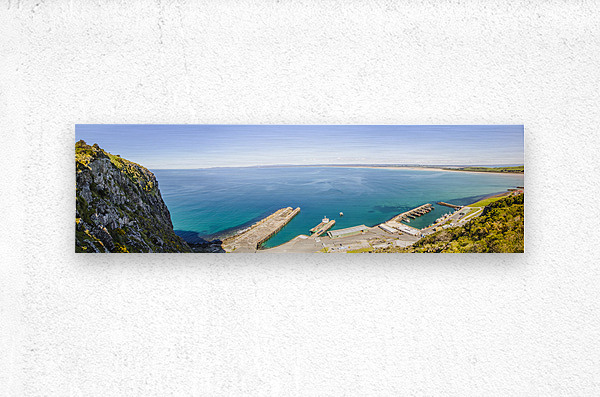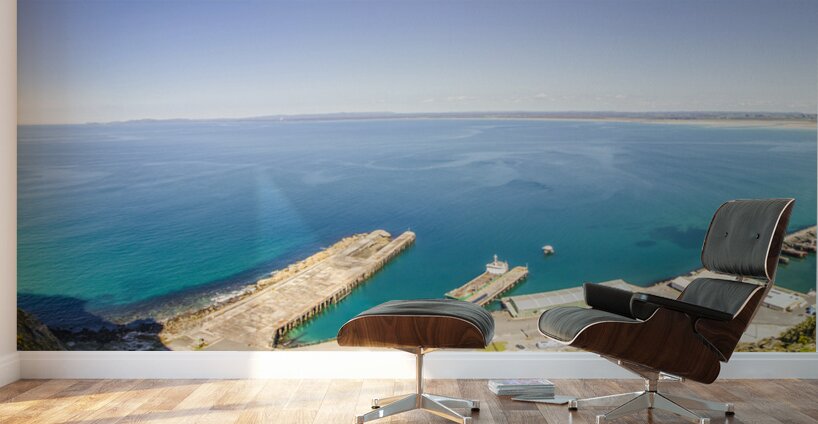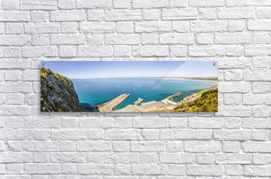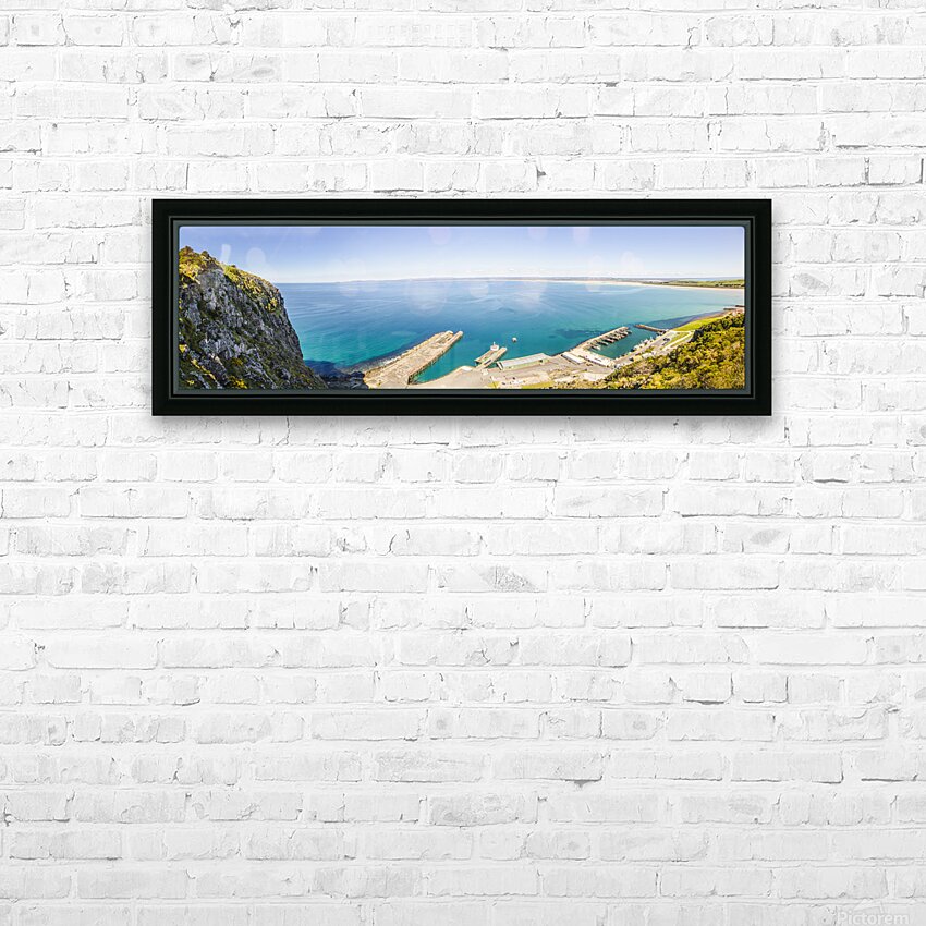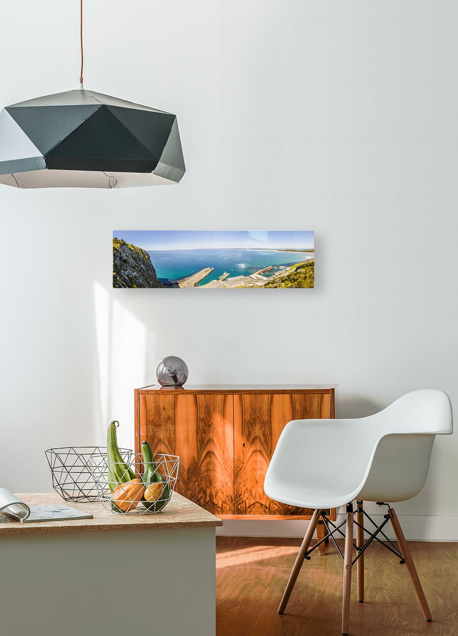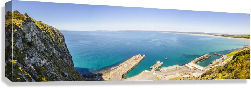 Wide aerial view on a picturesque ocean marina landscape with sea jetties and docked boats. Fisherman’s Wharf Lookout Top of The Nut Stanley Tasmania