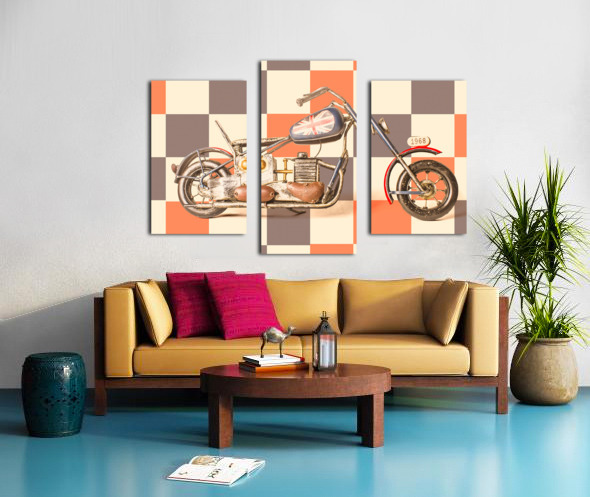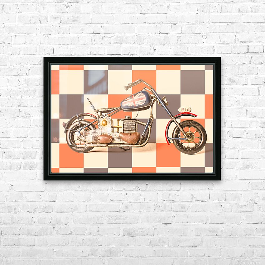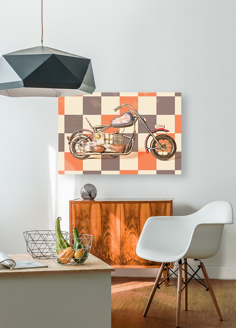 Retro styled transport photograph on a tin toy motorcycle with classic English flag insignia. Brit bike