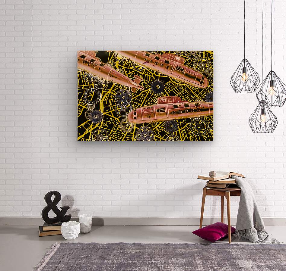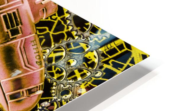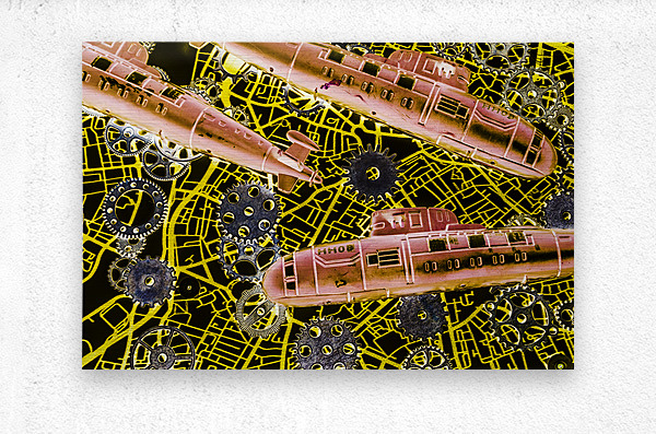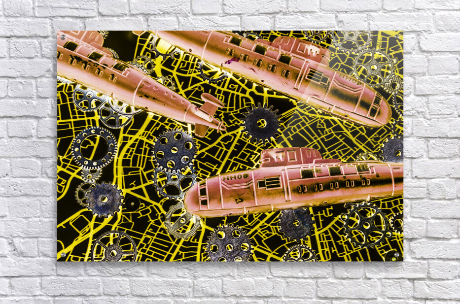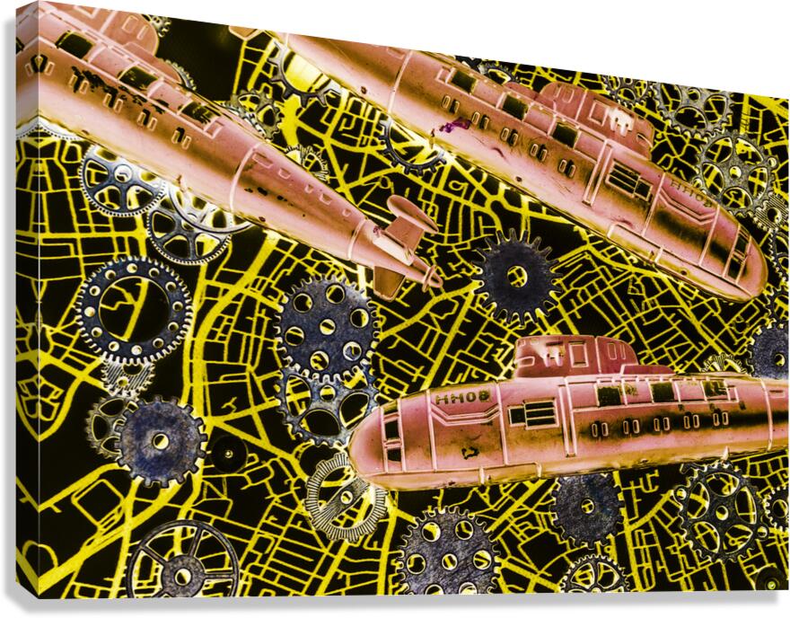 Creative still life artwork on a mix of industrial cogs and gears of submarine warfare. Mechanised waters