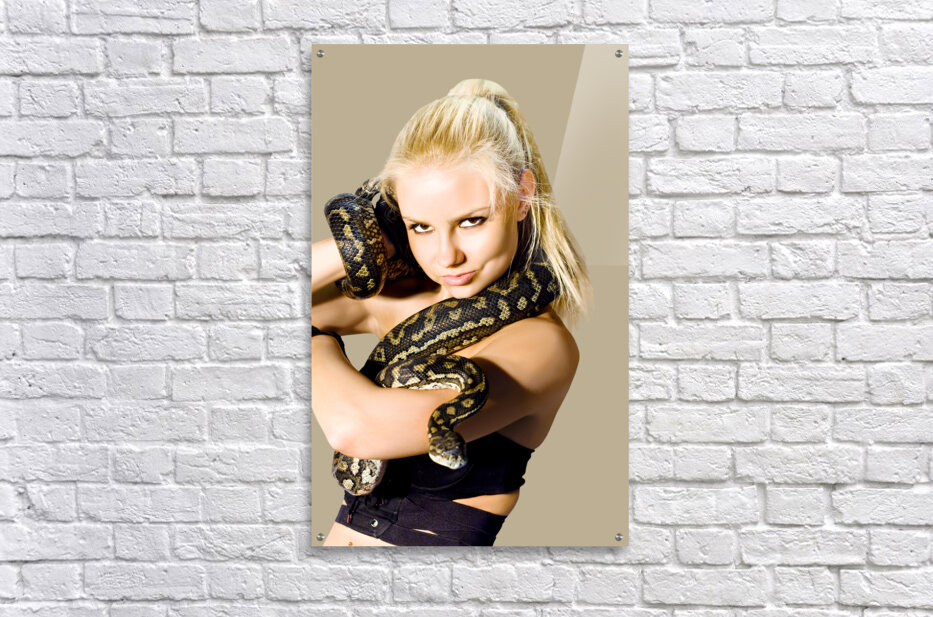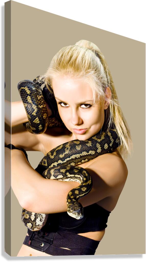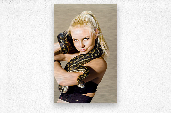Danger caution and concern slither along a gorgeous blond womans arm while holding a python snake isolated studio photo