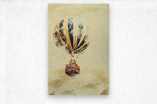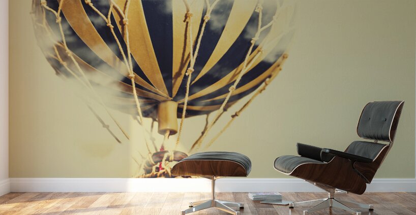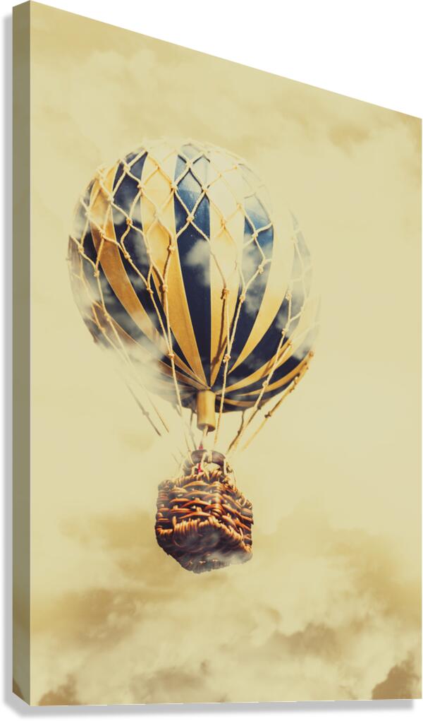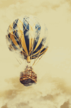 Vintage fairytale scene of a hot air balloon soaring into a misty adventure. Dreams and clouds