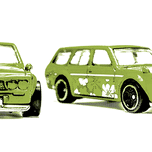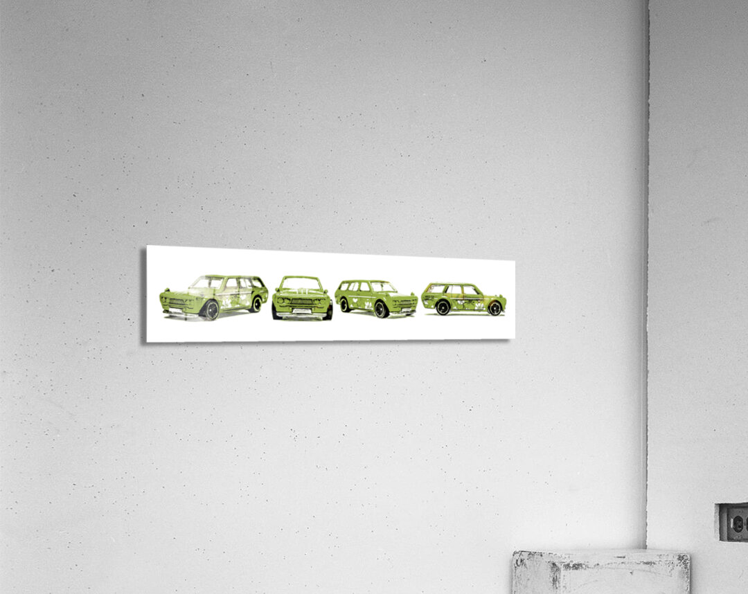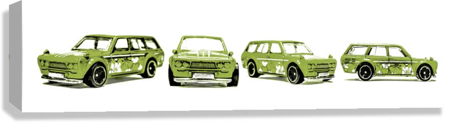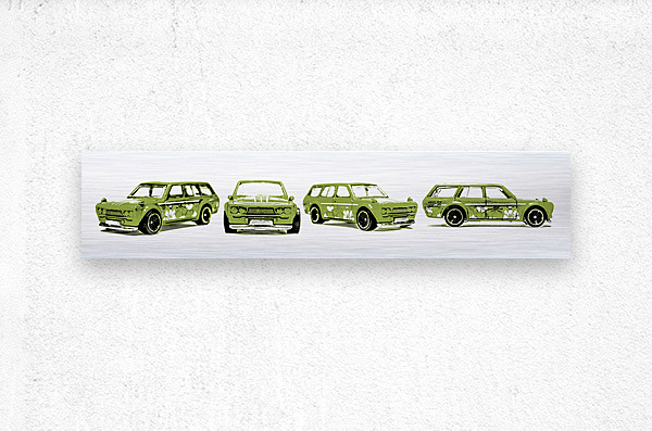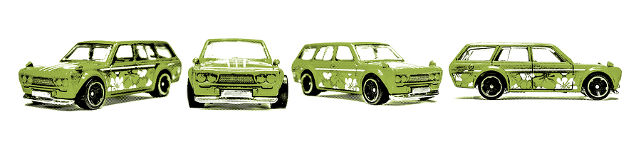 Pop art comic strip on a lineup of 1971 Datsun 510 Wagons in typical retro styling