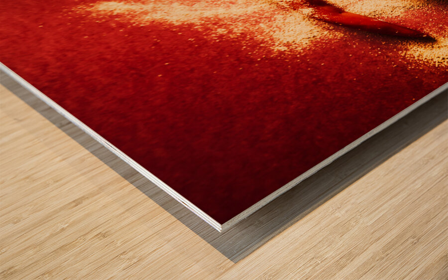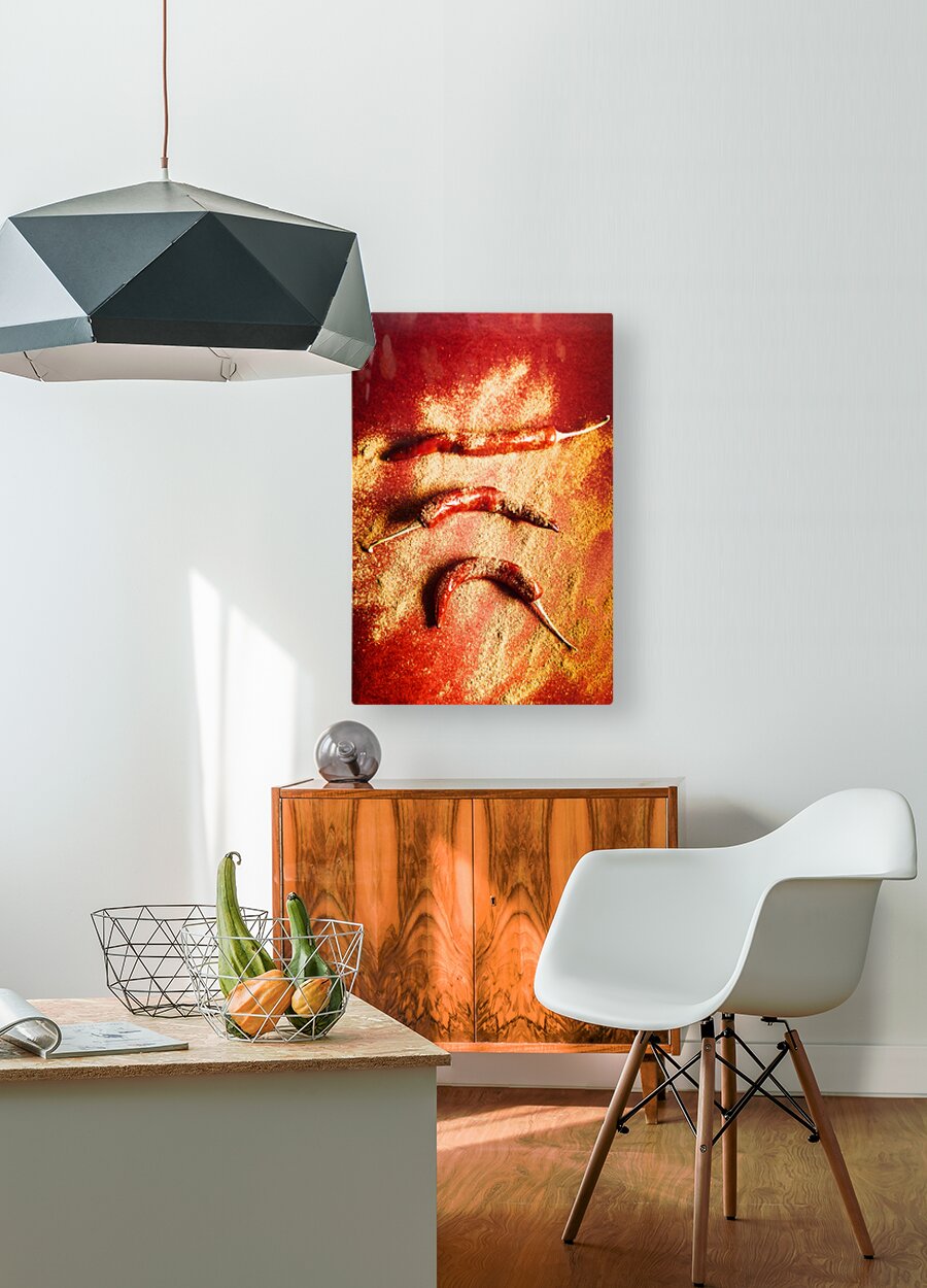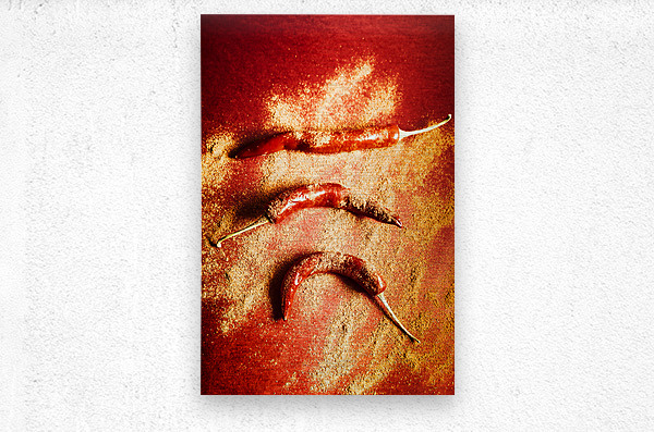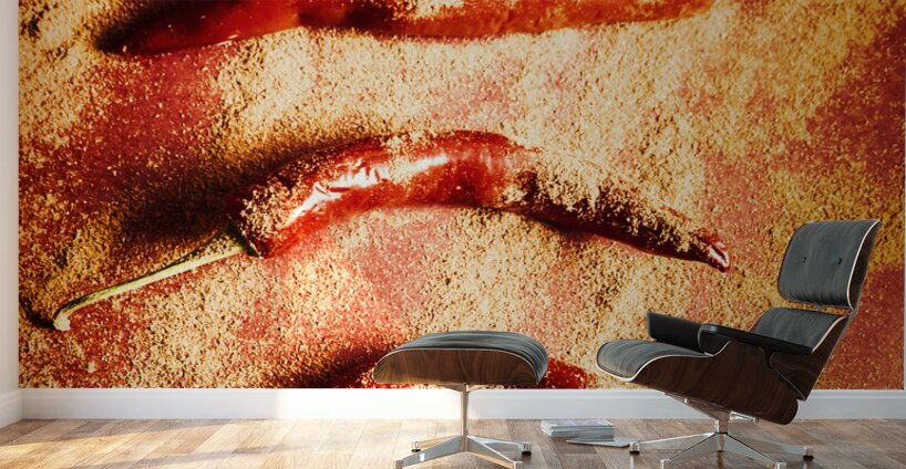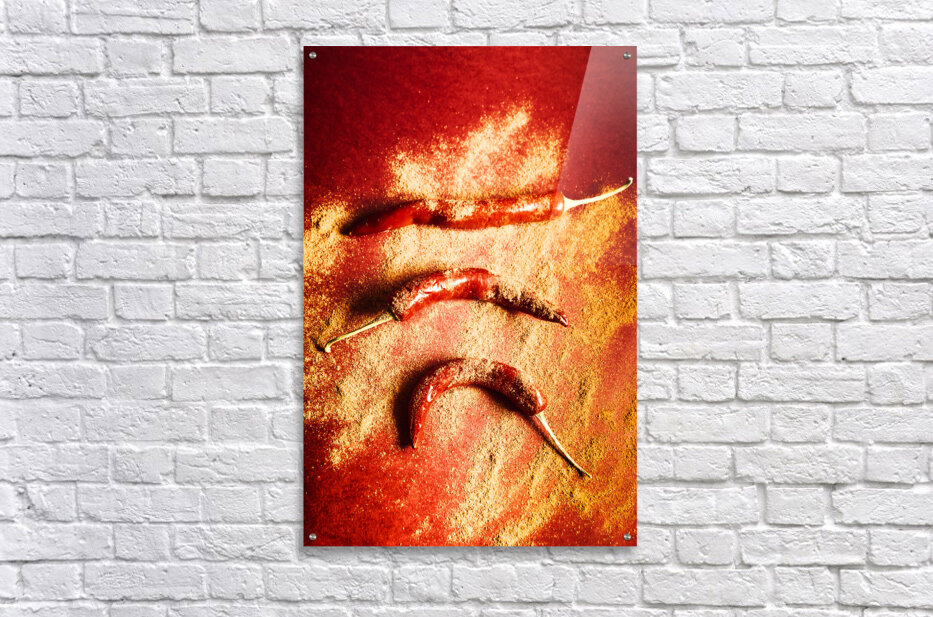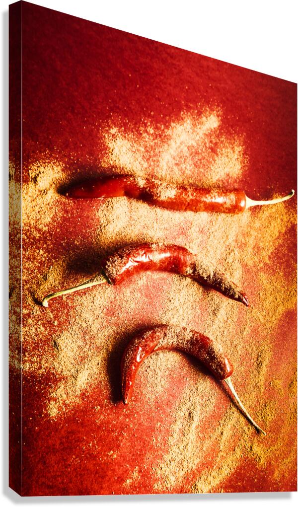 Creative Indian food still-life on red chilli peppers seasoned in chili powder spice. Seasoning and spices