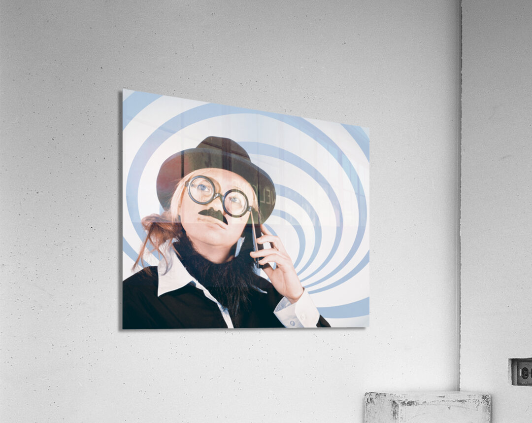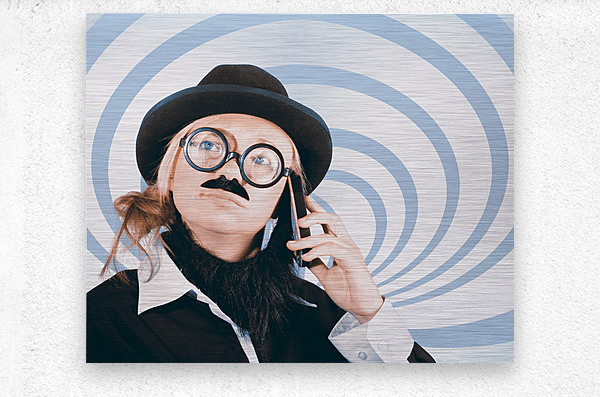 Odd retro businessman talking on modern mobile smartphone. Communication evolution concept