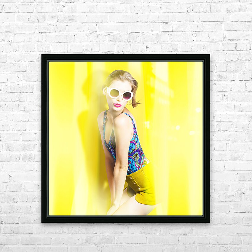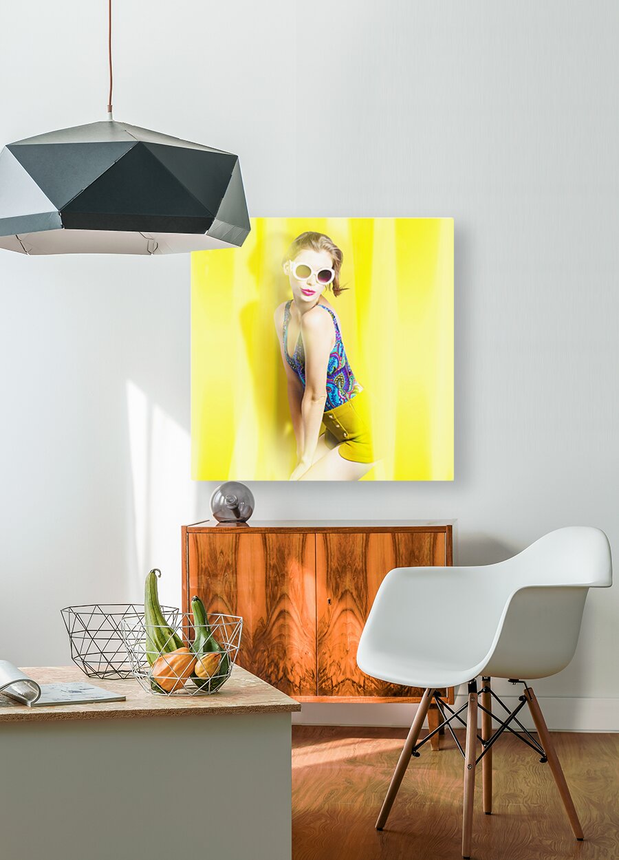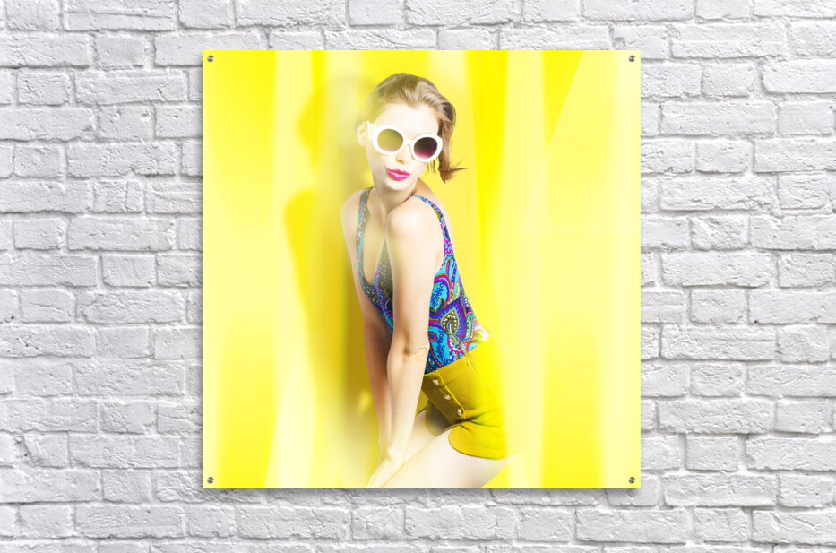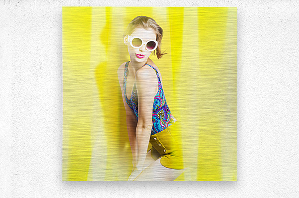 Attractive young retro woman wearing sunglasses on vibrant sunflared background. Beauty and fashion pinup girl