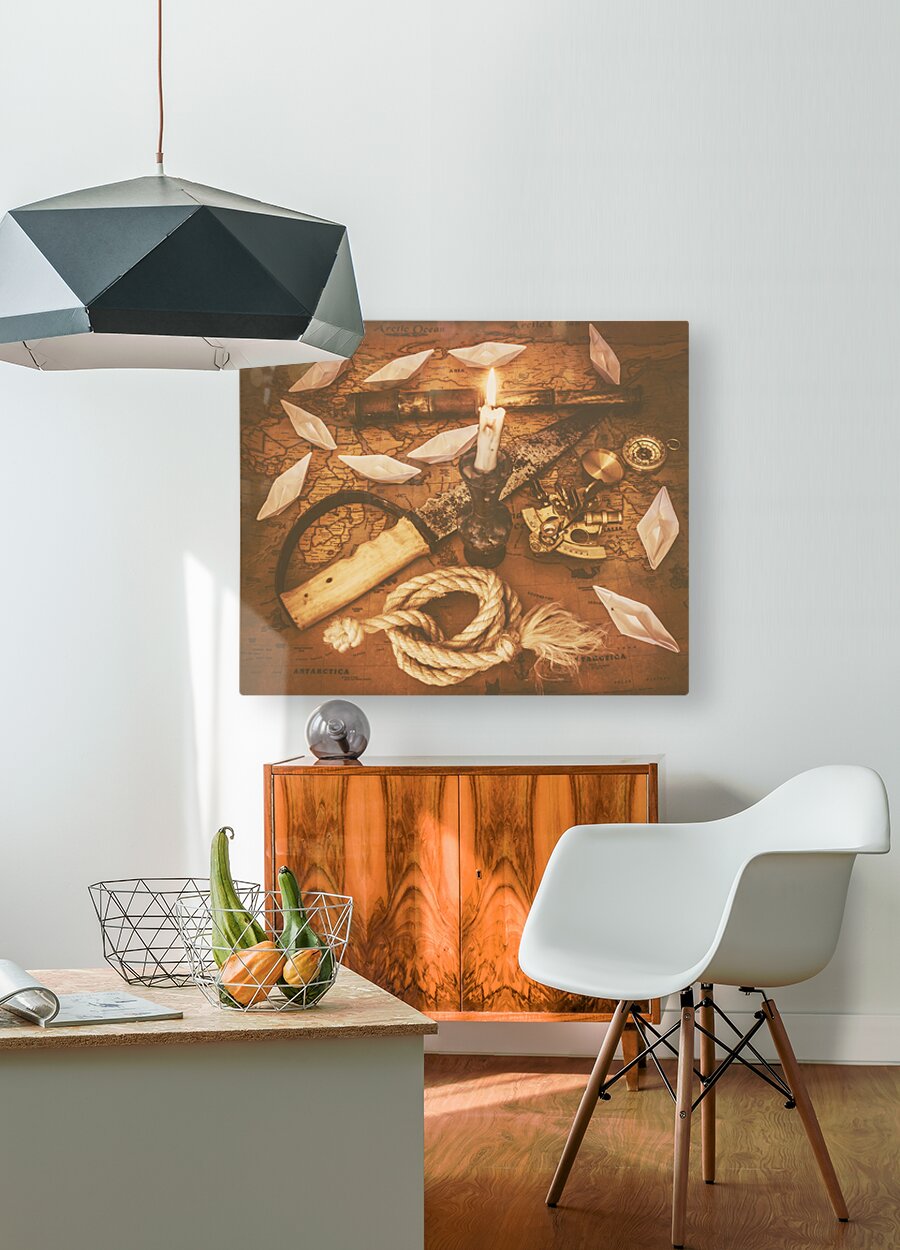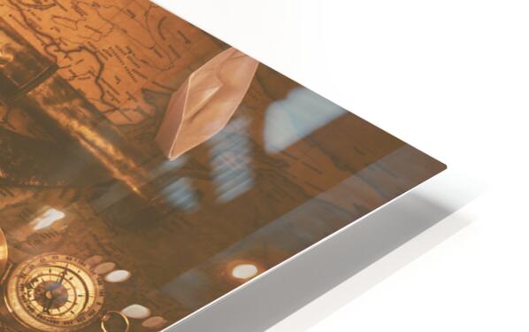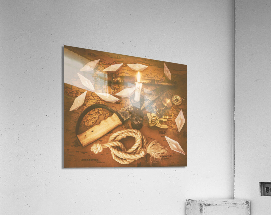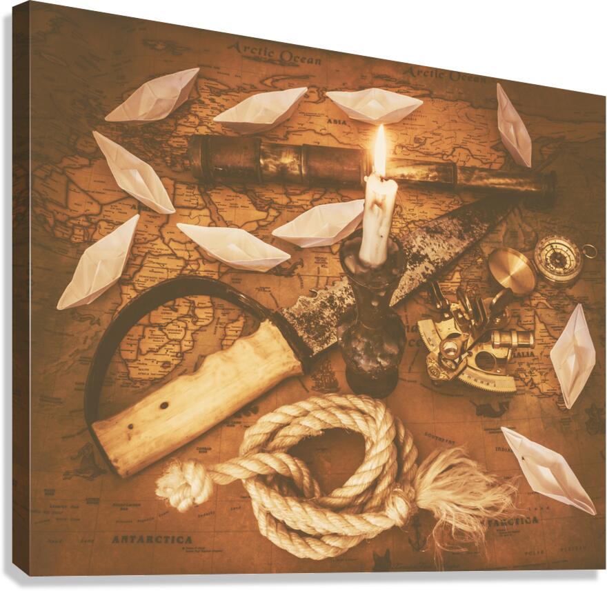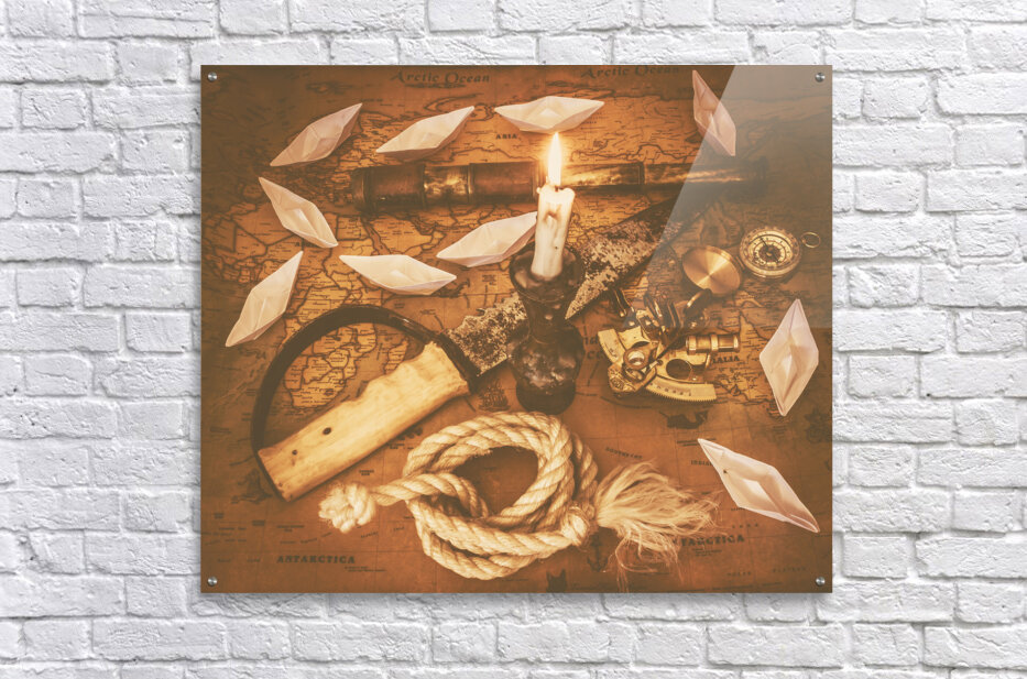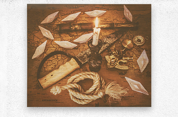 Golden guiding light seen with nautical navigational instrumentation with maps boats and adventures untold